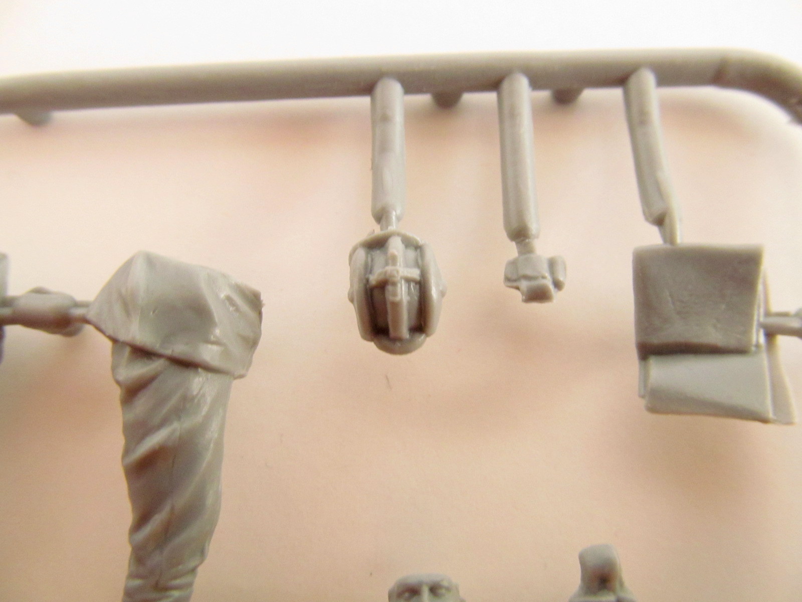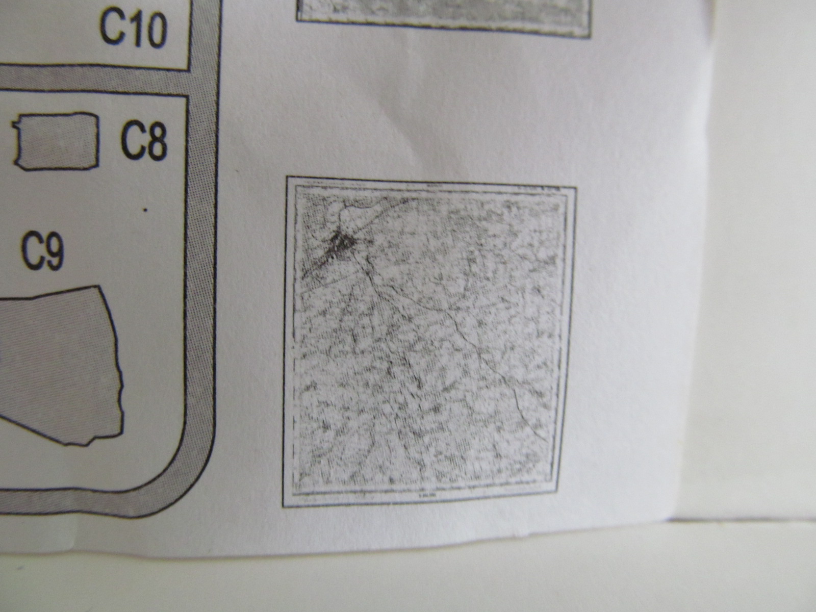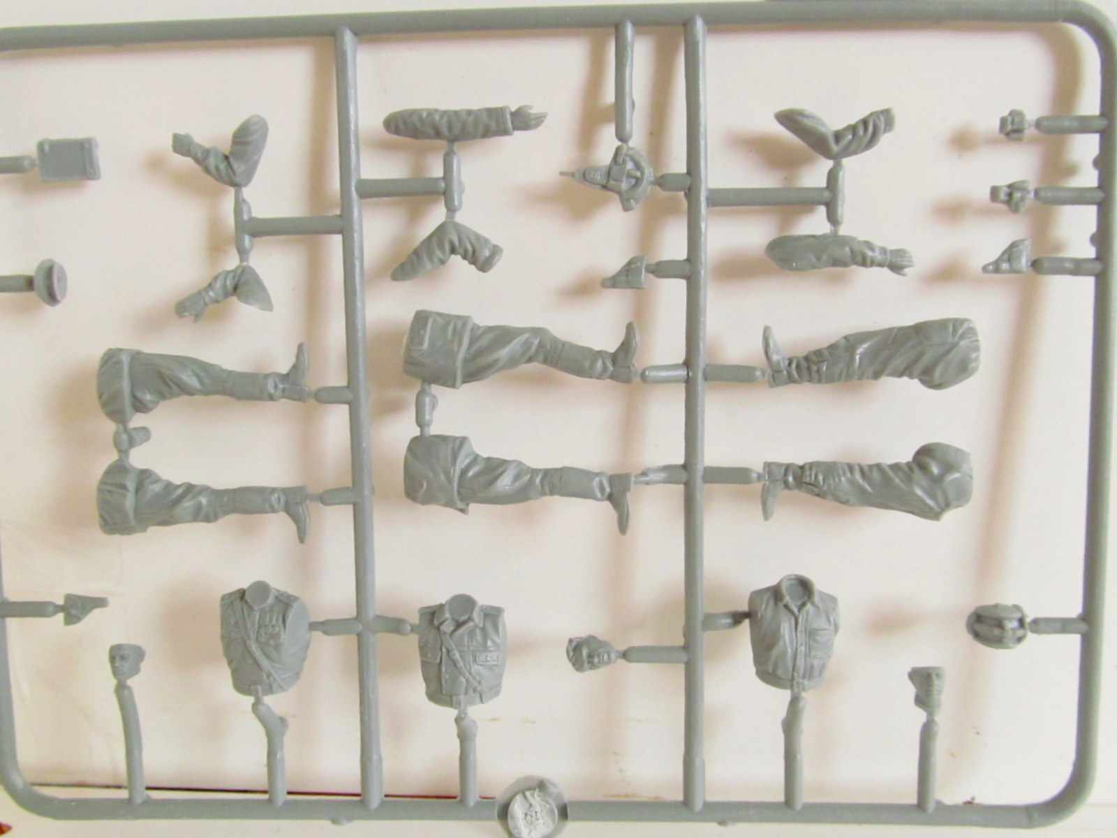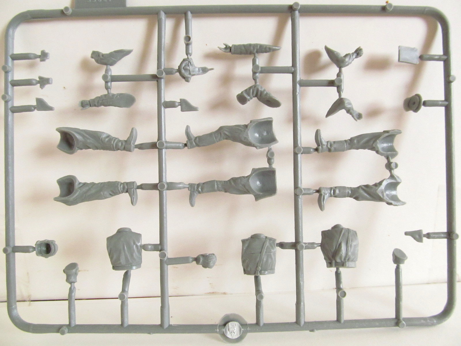 Набор я взял исключительно из-за танкистов, в коробке с боковой загрузкой, лежат 2 литника в пакетике и незамысловатое обозначение деталей на бумаге размером 12смх5см, так же на бумаге присутствуют 3 черно-белые карты. На литниках 5 фигур офицеров и танкистов.