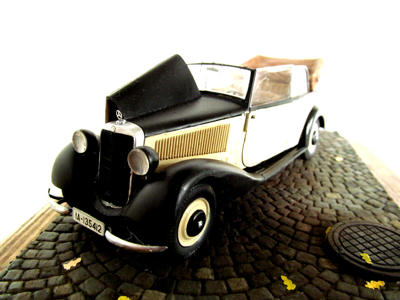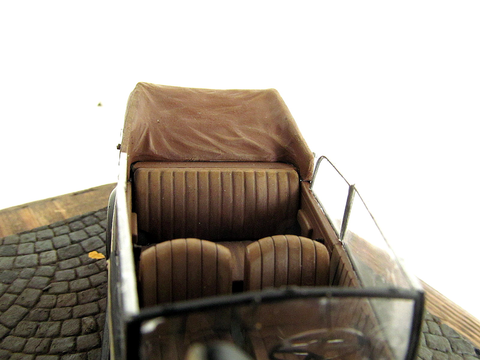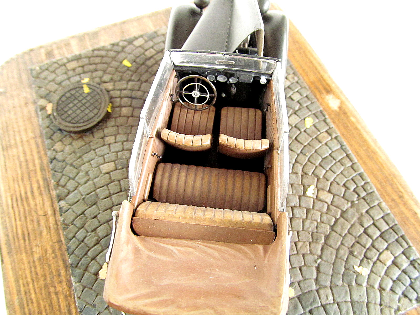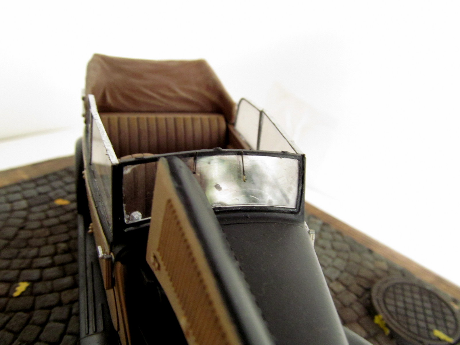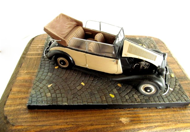 Представляю вам свой первый гражданский автомобиль. Окрас вёлся аэрографом красками валехо, лаки валехо, автополироль неизвестного производителя, пачкал пастелью, смывка Тамия, масло-неизвестного производителя. Подставка мини арт, листья Дасмоделс. Несколько слов о наборе: набор от миниарт, не было ни облоя ни утяжин, следы толканелей с внутренней стороны так что их не видно на собранной моделе, понравилось наличие платы фототравления, инструкция на высочайшем уровне, не понравилось то что военную версию автомобиля невозможно сделать так как нету бронирования фар. Доработок почти никаких не было кроме топливных шлангов и проводки двигателя. Спасибо за внимание. Каску одел к табуреткам готов