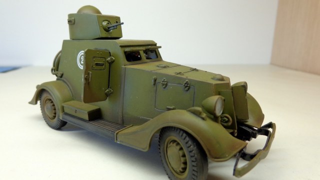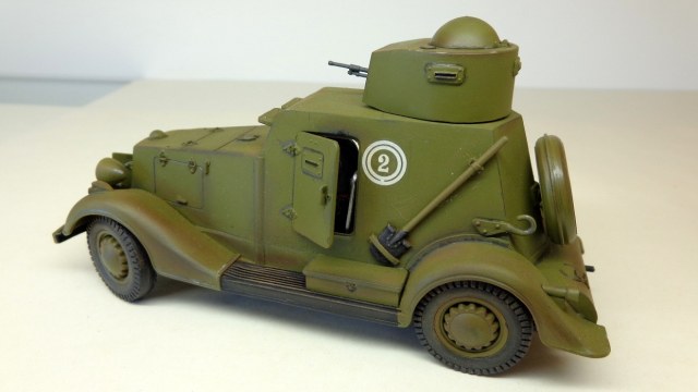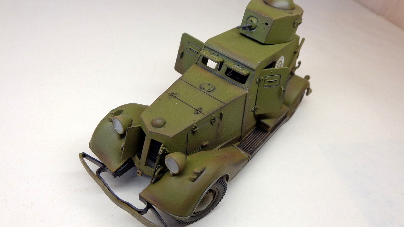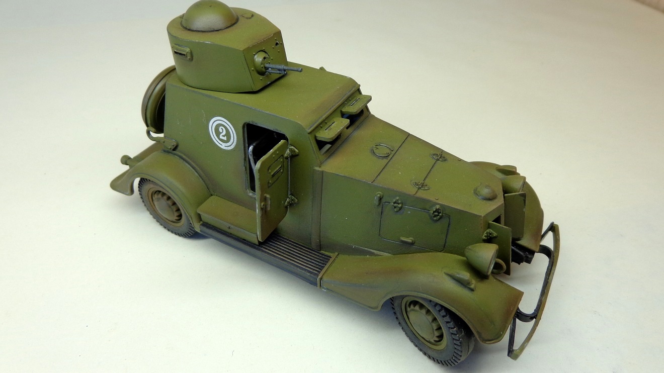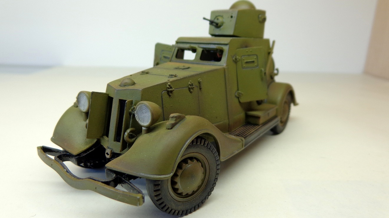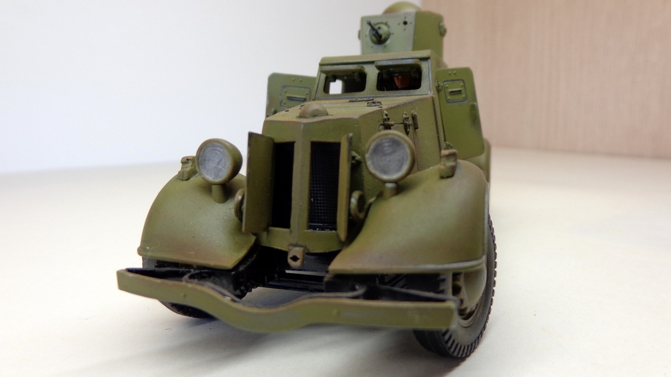 Эта модель сделана без малого двадцать лет назад, кажется в 94 или 95 году. Тогда только-только появились модели питерской фирмы "ALAN". Облик бронированной "эмки" был чем-то мне симпатичен. Краска нитро, наша отечественная. Я ее мешал для каждой модели по отдельности, поэтому цвет никогда не повторялся. Два года назад приобрел тамиевскую "пудру", как раз попробовал на броневичке.