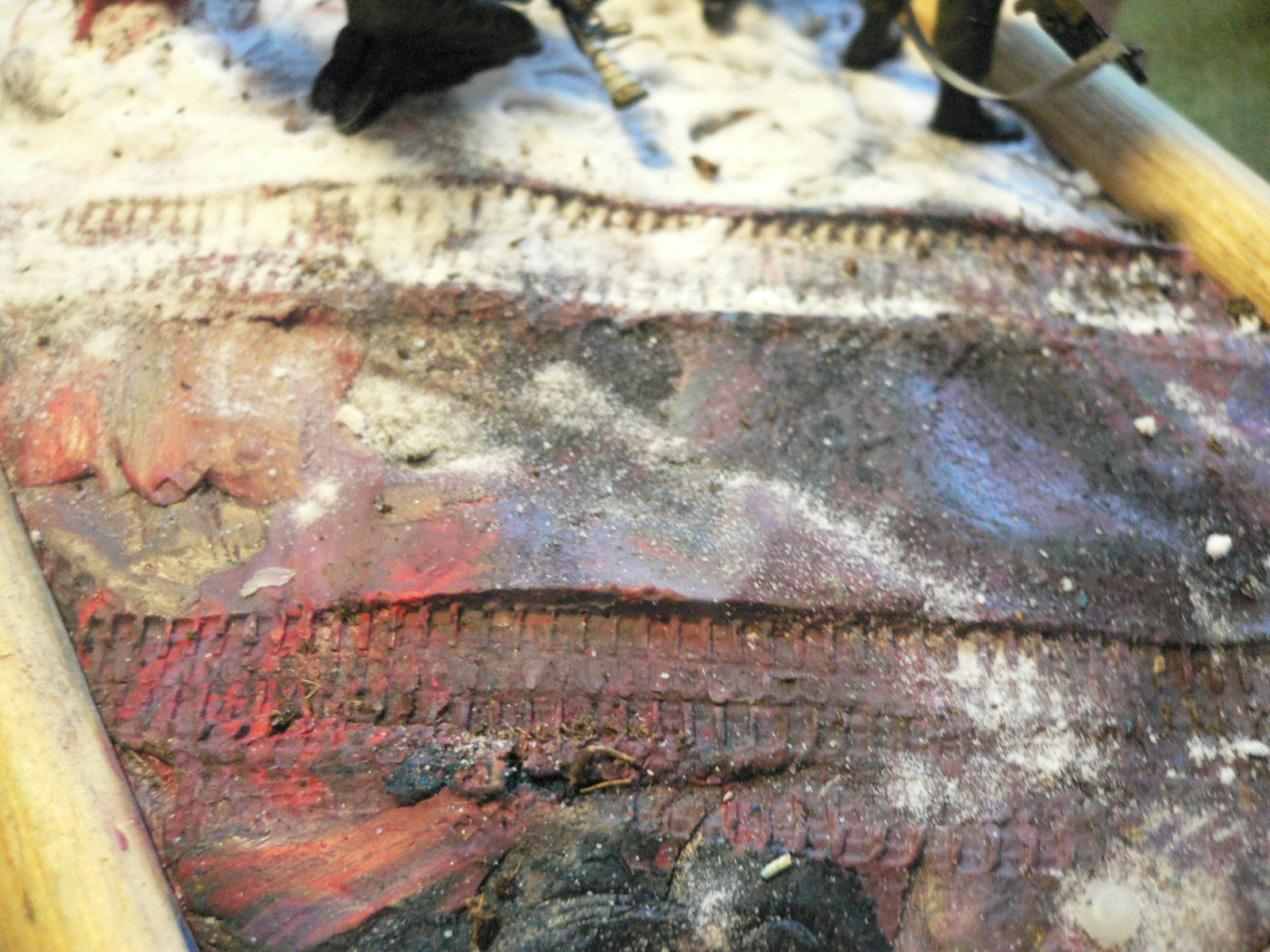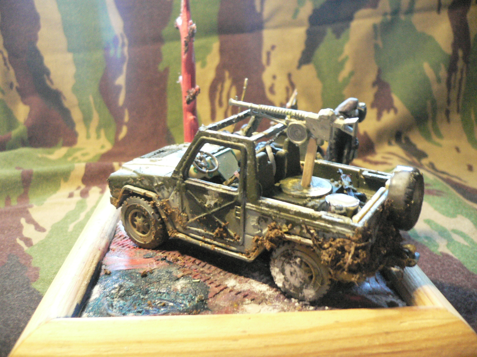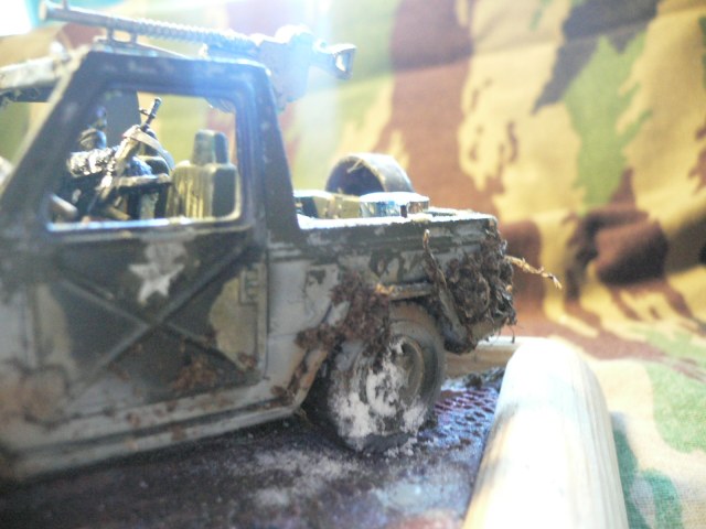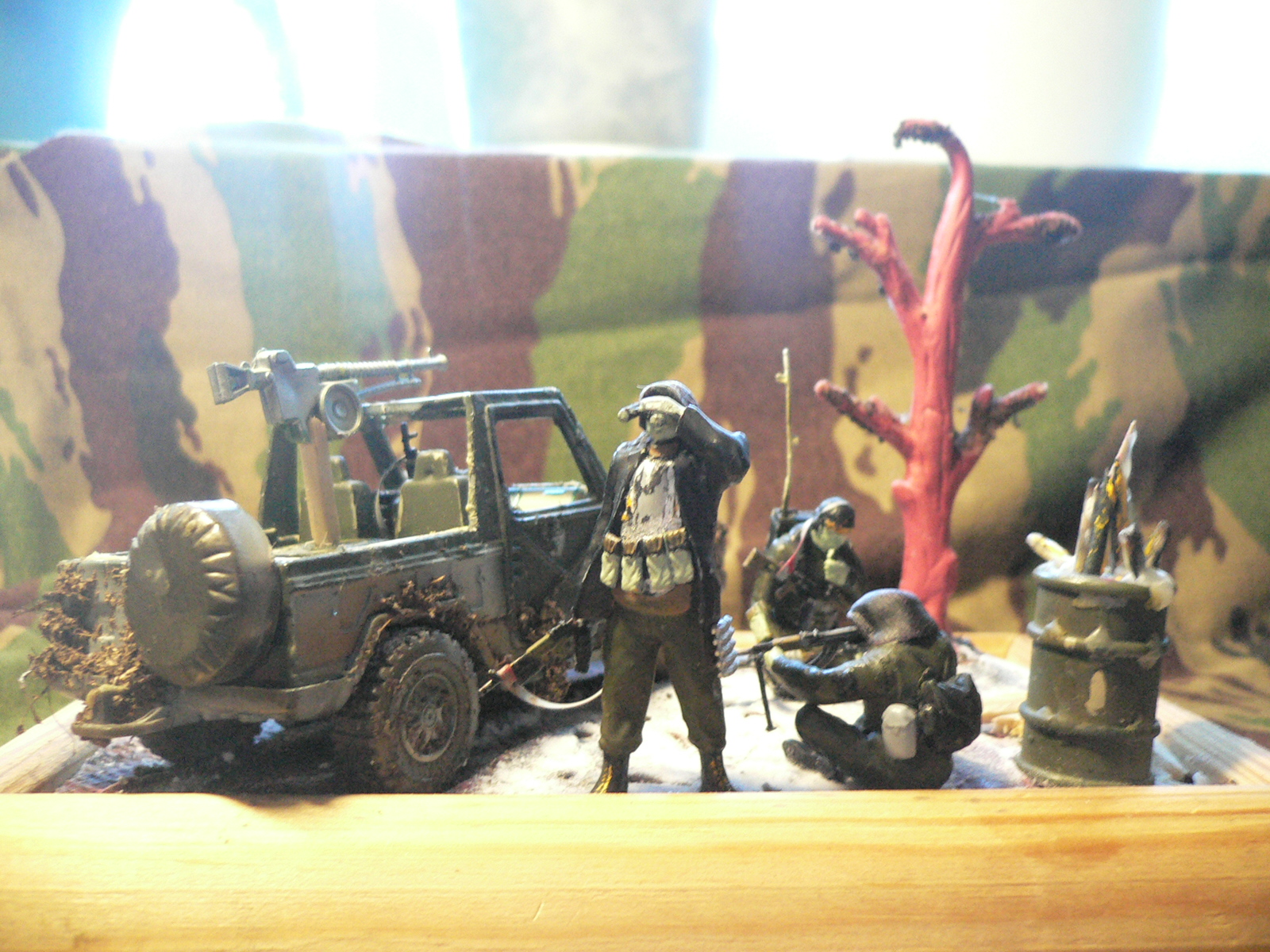 Фото плохое (качество, освещение, фон и ракурсы), рассмотреть что-либо не представляется возможным. Да и над самой диорамой, работать и работать. Грязь на машине не получилась, дерево явно марсианское, костер в бочке, тоже выглядит не убедительно, как и само основание диорамы, присыпанное снегом.