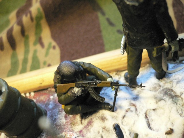 Давно задумывал сделать маленькую, понятную, диорамку. Солдатики от "Звезды" очень порадовали, качество на ура! Красил аэрографом, Тамией оливковый, черный и т.д. Снег-сода, грязь-земля, в углу лужа, с автоматами было интересно повозиться, для них покрасил изоленту на обоймах, также ремни.....В общем все, судить вам господа! С уважением, Никита.