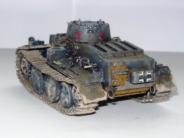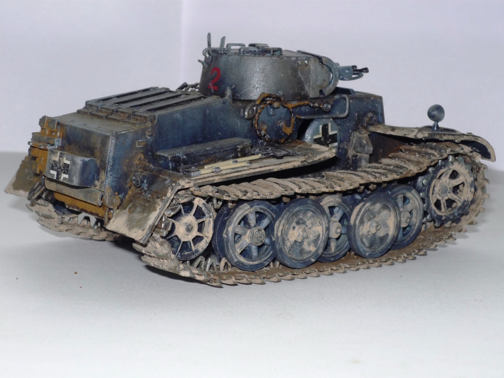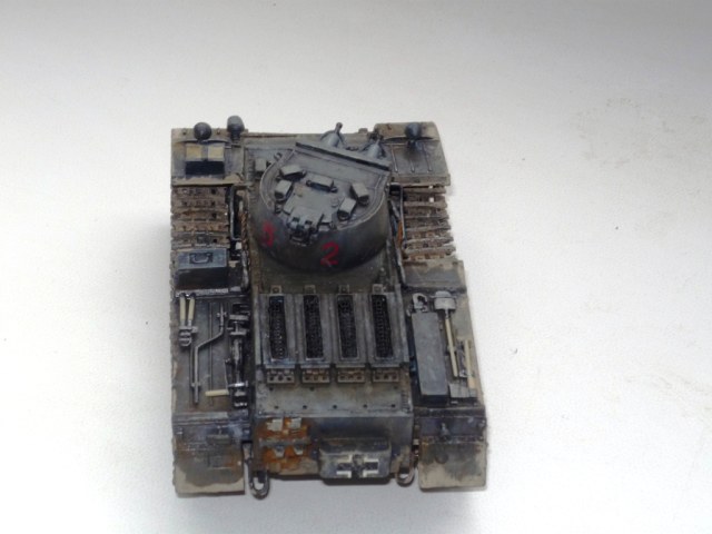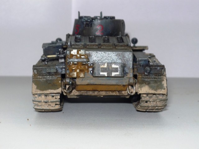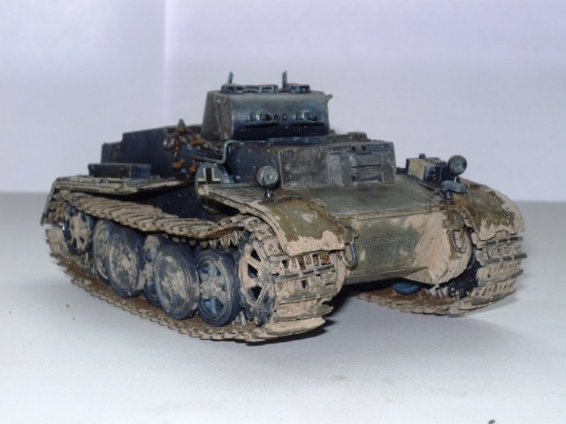 Сухая грязь вышла хорошо, жидкая не удалась; ржи однотонной очень много и не к месту; конвойный фонарь в базу не есть гут; ручки клещей должны быть цвета бордо; фары - беда; смотровые приборы надо бы застеклить; крест на правом круглом люке не айс. Кисть дает слишком толстый слой - лучше автоэмаль из баллончика (в идеале - аэр, но я им сам не пользуюсь...). А для первой модели очень хорошо. Моя гораздо хуже была...