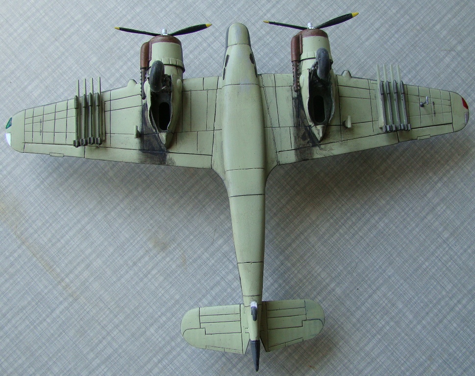 Модель перед окраской была загрунтована серой грунтовкой от Tamiya. Красил в основном акрилом HobbyColor, в небольших количествах (внутрянка, стойки шасси, капоты, патрубки и ракеты) использована акрилуретановая краска АКАН. После краски был нанесен слой футуры (всё, больше я её аэрографом наносить не буду – не получается нормально). Декали приваривались жидкостью DecalSoftот Revell. Расшивка (мой первый опыт нарезания расшивки – просьба сильно не пинать) выделена темной смывкой MIG, ниши, стойки шасси и двигатели попачканы «масляными пятнами» также от MIG, колеса – сухим пигментом MIG. Антенна из колготочной нитки. БАНО у этой машины довольно большие, поэтому я не рискнул делать их из MikroKristalKlear, как уже делал раньше, и просто покрасил их прозрачным акрилом от Tamiya. Финишное покрытие – матовый лак АКАН.