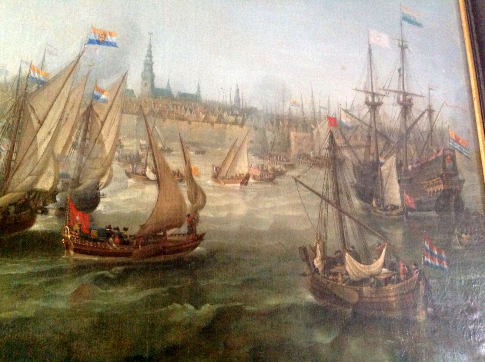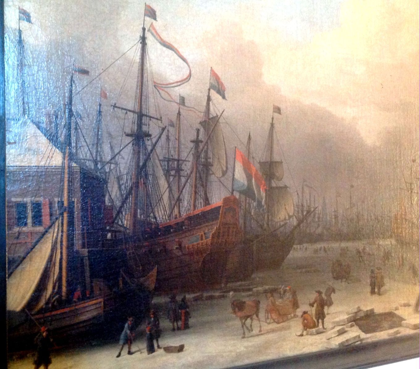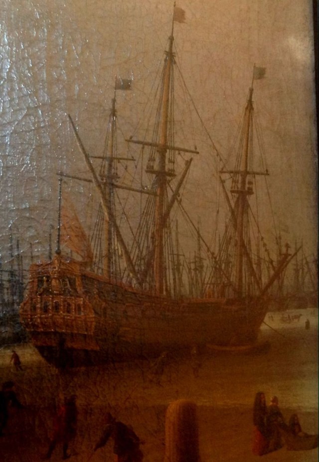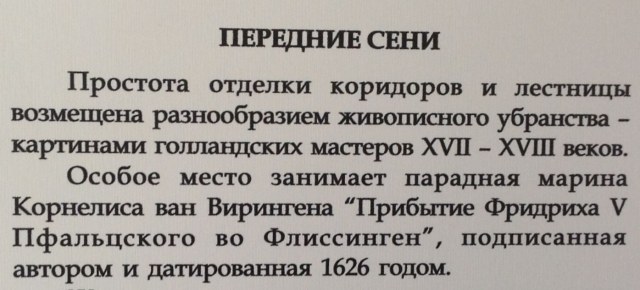 Случайно набрел на это полотно в музее-усадьбе Кусково в Москве. Часто бывал там в детстве, вроде неплохо помнил Голландский домик, а про живопись забыл. Оригинальная картина голландского живописца Корнелиса ван Вирингена, датируемая 1626 годом. Размер достаточно большой - 1 метр на 2 приблизительно. Попутно снял несколько фрагментов других голландцев.