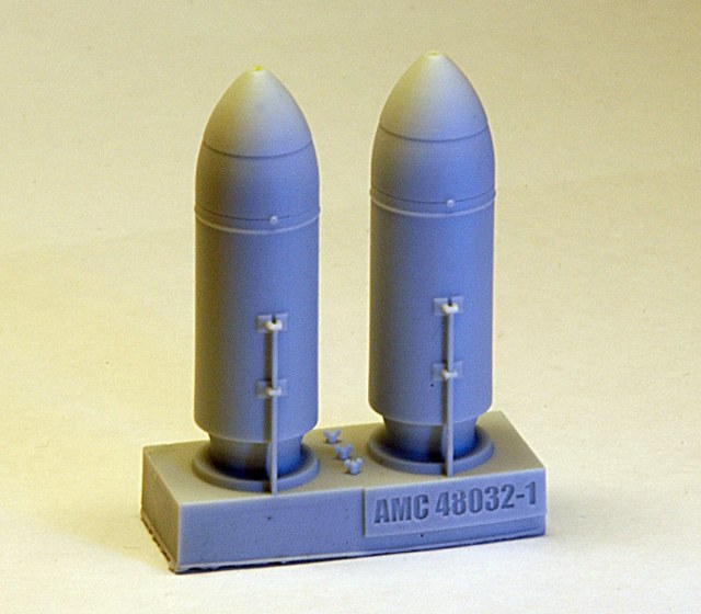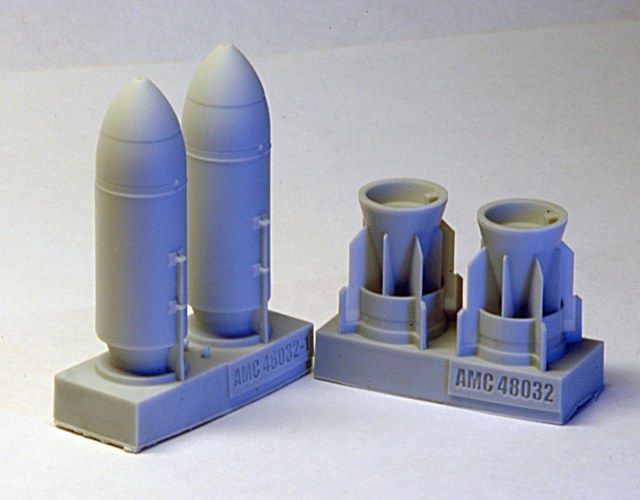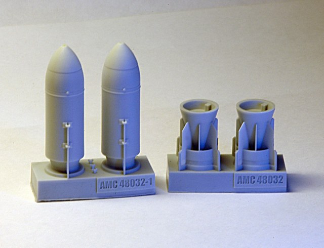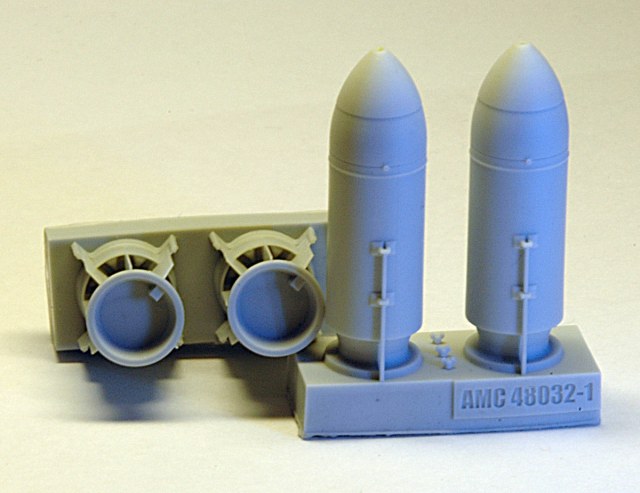 Новый набор АМС 48032-1 представляет вариант ЗАБ-500Ш с носовым обтекателем. Ранее выпущенный вариант 48032 ЗАБ-500 (http://karopka.ru/community/user/9176/?MODEL=321646 для сравнения добавил в обзор пару снимков с обтекателем и без оного) без обтекателя (на реальном изделии еще без механизма расцепления и командного прибора КП-527) используется для подвески на бомбодержатели, оборудованные прутковой системой управления взрывателем.