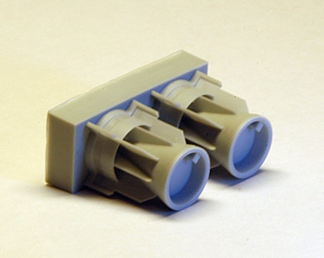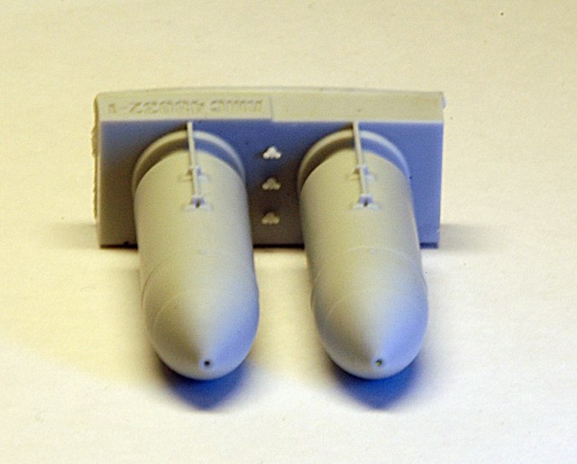 В прозрачном пакете находится буклетик с описанием и две отливки: одна с хвостовыми и одна с носовыми частями. Набор содержит две бомбы.