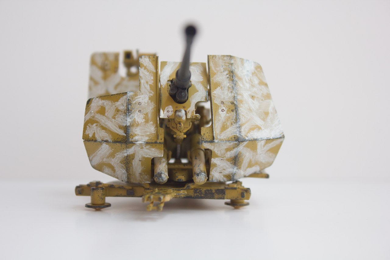 Красил кистью , краской от Mr.Hobby ( база ) , сколы делал кусочком губки и тонкой кистью , белые полосы широкой кистью краской Model Master . Попытался изобразить окрашенную пушку на скорую руку известью или белой краской , на сколько правдоподобно получилось - судить Вам .