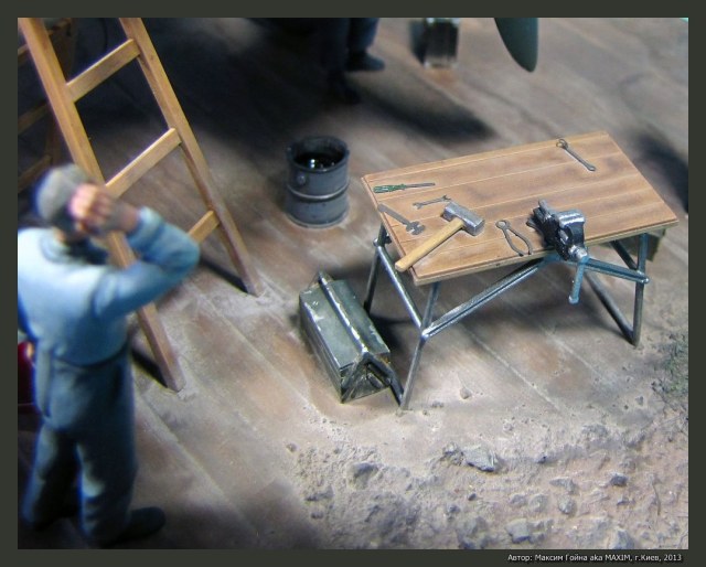 Сама поставка(смола) Verlinden, три фигурки из четырех(четвертая из набора, офицер в кожаном комбинезоне) Verlinden, поклажа (бочки, ящики, канистры) Verlinden. Лестница, стол и инструмент на столе(травление) из набора Eduard.