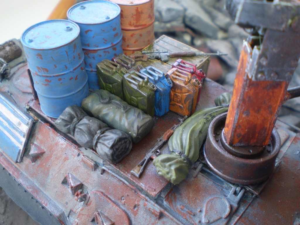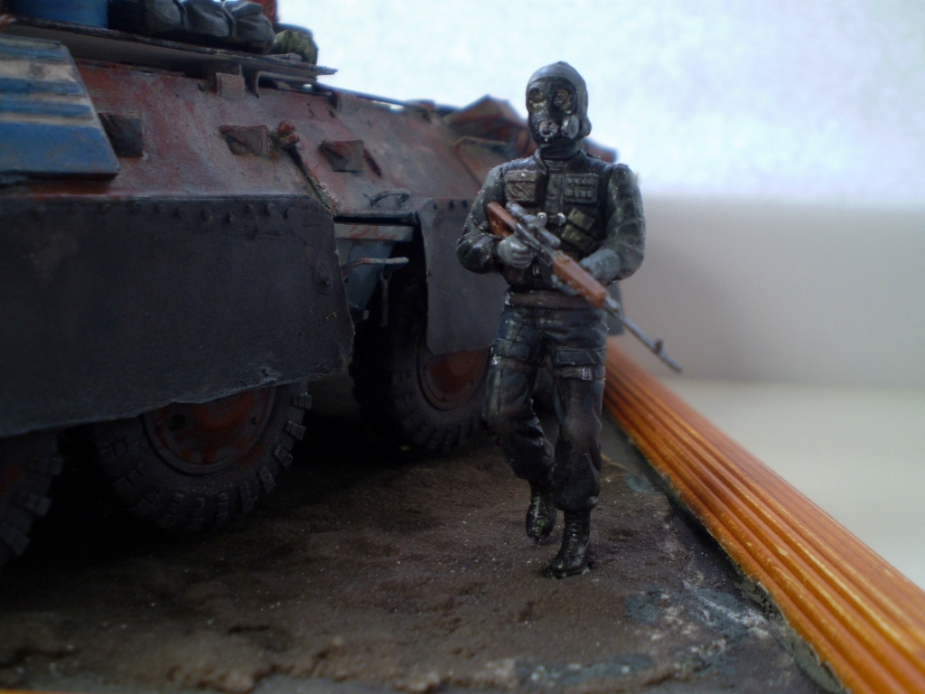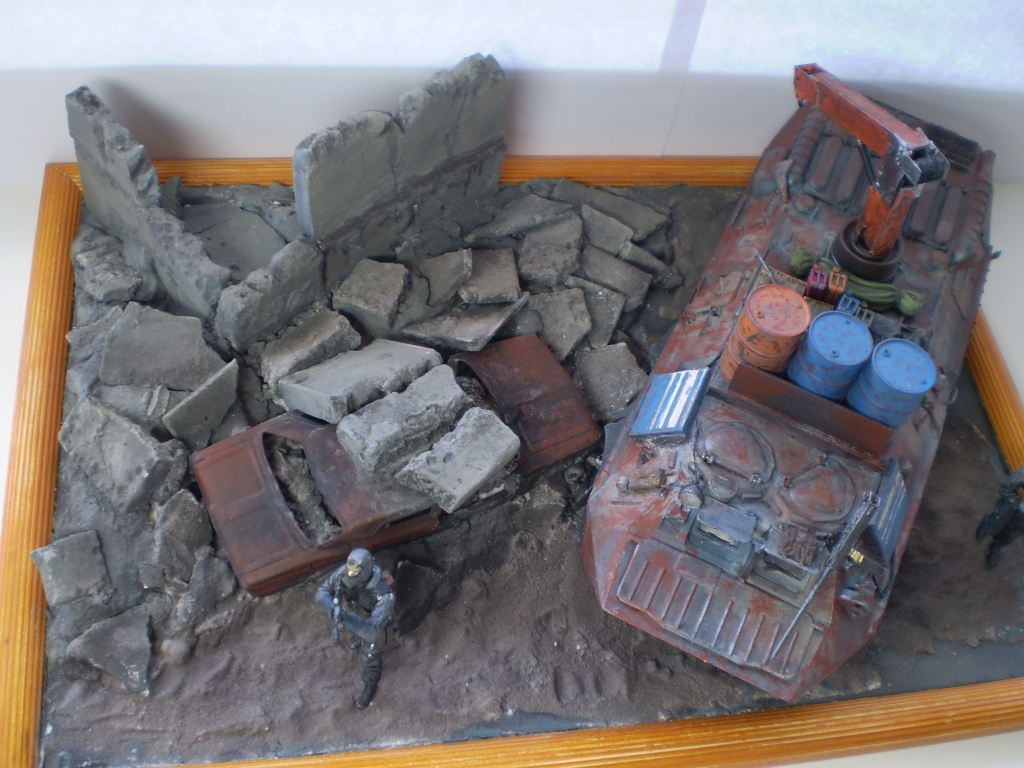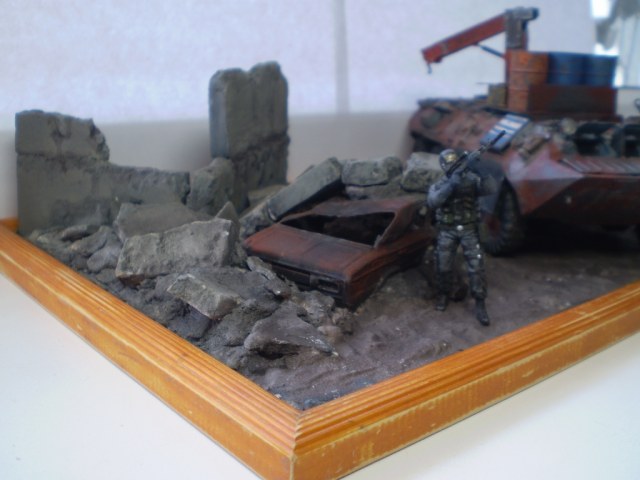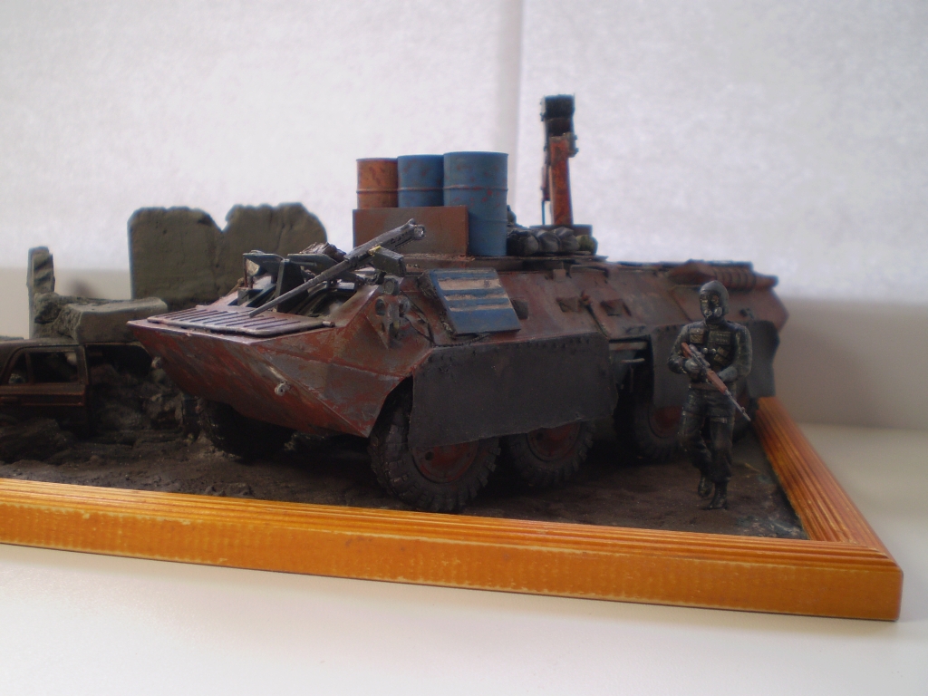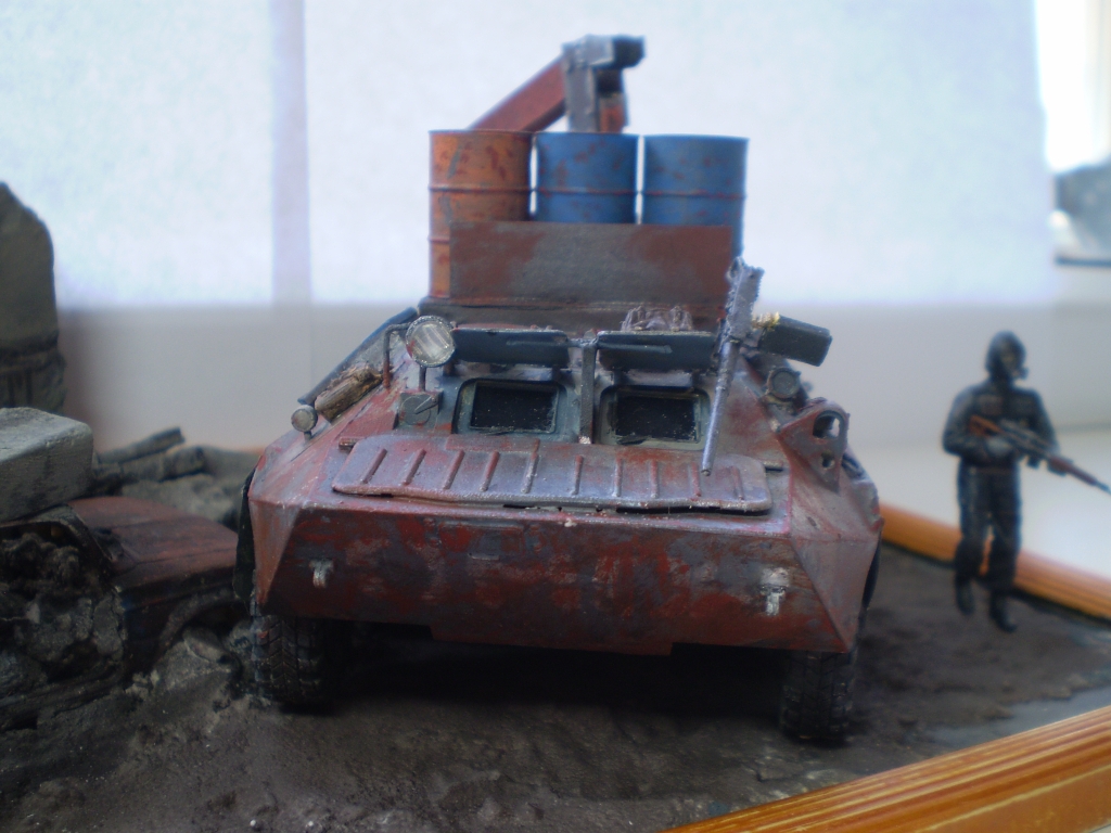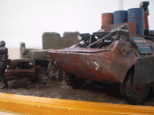 Задумка интересная. Грамотная (!) предыстория. Честно, смотрел с удовольствием. Но покраска и фото немного подкачали. Красивая ржа на жигулях, почему не сделали такую-же на БТР? На БТР-е выглядит разводами. Даже с кисточкой можно технику лака для волос применить. Особенно для везеринга бочек. И пигменты не помешали бы. Да, кстати, бочи с канистрами упадут на первой же кочке. Не закреплены ведь. Понравилась окраска фигурок, но их надо матовым лаком покрыть. Фара краской заляпана.