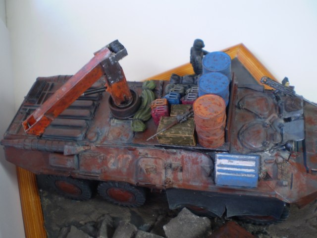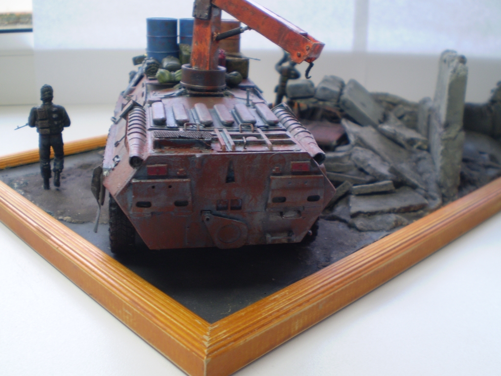 что мне больше всего понравилось в этой работе - кран на БТРе, он тут самый реалистичный, ну и развалины. А БТР уж слишком ржавый, да и цвет ржавчины такого металла ИМХО должен быть другого цвета.