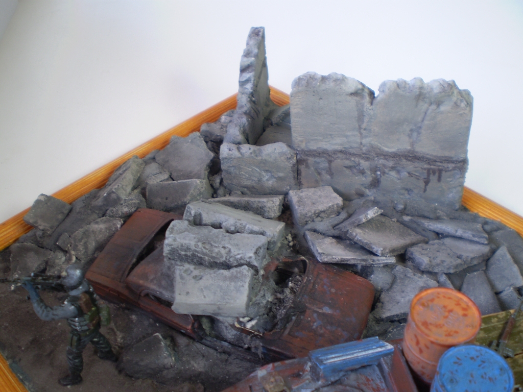 В целом работа очень интересная! У меня друг тоже темой постапокалиптики увлечён, нечто подобное делает, поэтому и Вашу работы было очень интересно и приятно посмотреть! Результат хороший, но и расти всегда есть куда) Понравилась окраска хлама, заваленый жигуль))