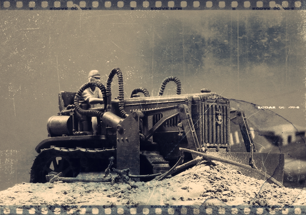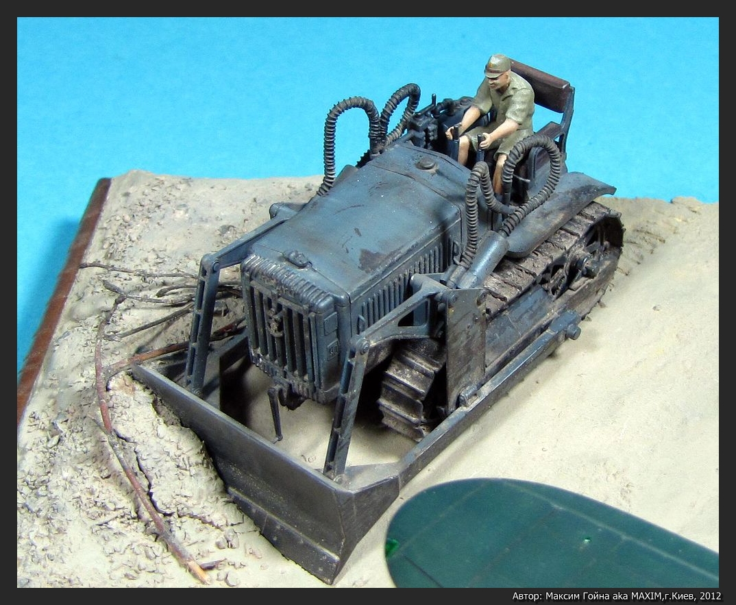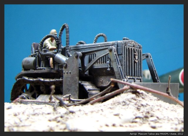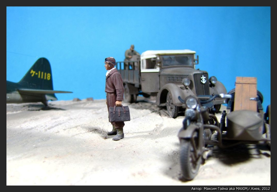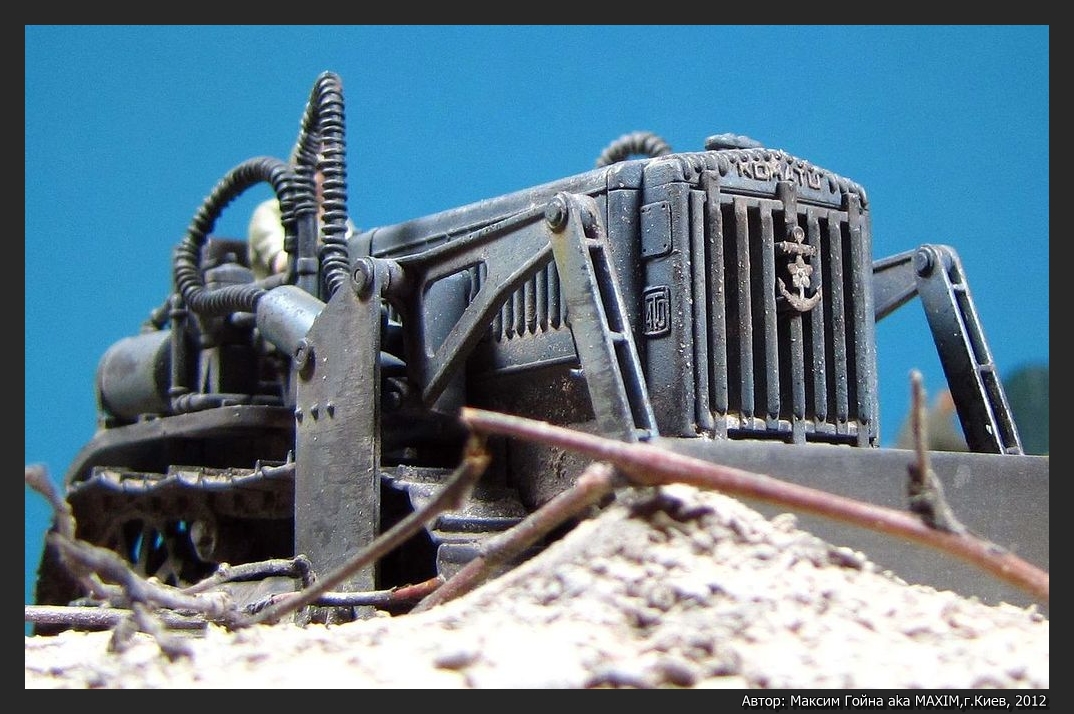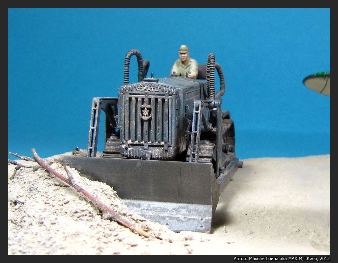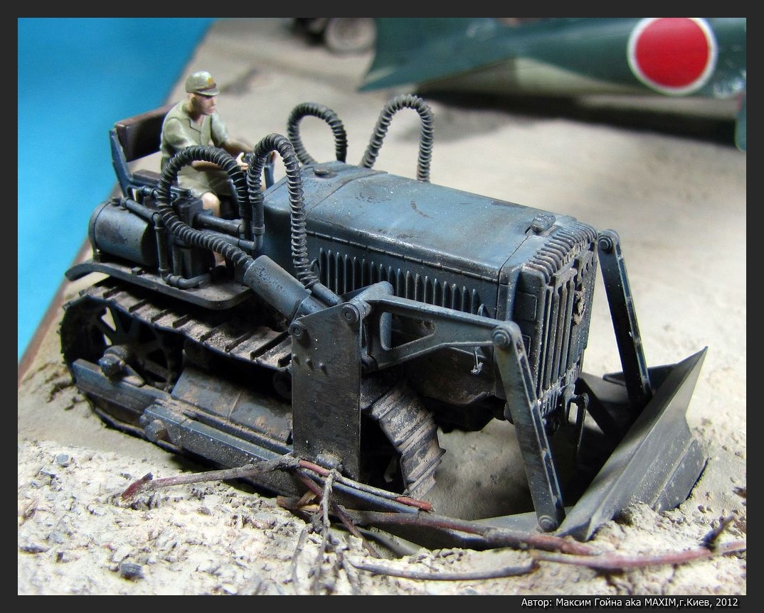 Бульдозер KOMATSU G40 от Tamiya и набор травления к нему от Hauler. Мотоцикл TYPE 97 Sidecar от Hasegawa. Грузовик ISUZU TX40 TYPE 97 Sidecar от Hasegawa. Фигурки выбраны выборочно из тех же коробок и остатков.