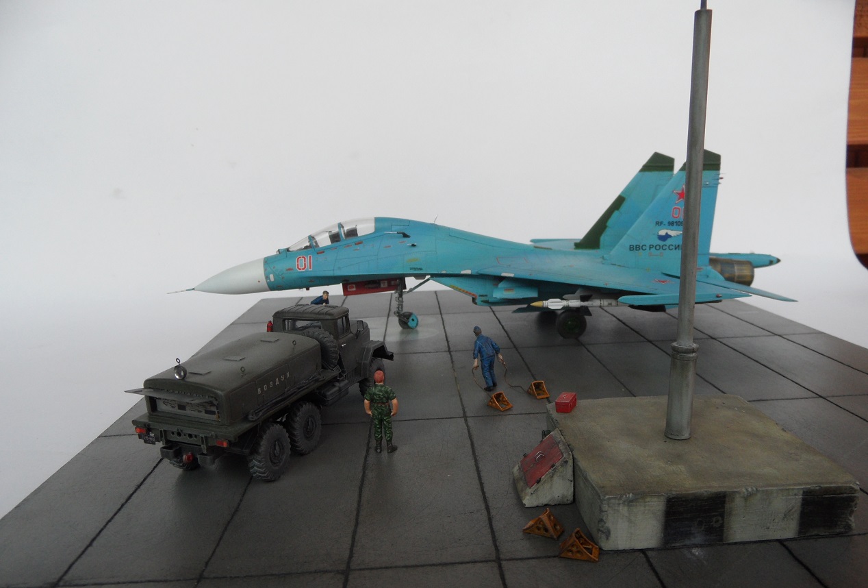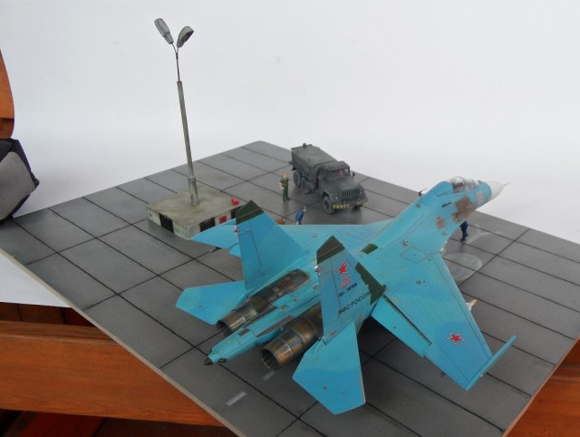Всем привет! Закончил наконец Су 27 , времени небыло , и модели я строил урывками. Из доработок - стойки шасси, колеса Эльф- спасибо Володь, травление дрим моделс, сопла дрим моделс- снял с су 30 Мкк, ПВД того же производителя. Деки Бегемот. Модель окрашена из баллончиков краской Мотип. Борт неимеет прототипа, схема камо и цвета взял с Су 27 УБ № 64- там весь полк подобно окрашен, да и су 27 свежие имели подобную раскраску, я только пятна сделал светлее чем на одноместных сушках. Расшивка выделена Тамией. Борт сделал как будто он пришел с АРЗ, свежепокрашенный, с новыми опозновательными знаками. Для него решил сделать подставку, столкнулся с проблемой - нигде небыло в наличии плит ИСМ. Пришлось сделать из МДФ, плохо зашкурил- видны борозды от шкурки, ну да ладно плиты скоро завезут. Огромное спасибо Александру Карпушину " Акар", за предоставленные фотографии самолета, размеры столба - колонки ЦЗ, его фотографии и подсказки за Мат часть. Решил что на такой большой подставке один самолет будет смотреться куце- потому изготовил столб ЦЗ, основание гипс, фонари - выгнул из тонкого пластика, сам столб тянутый литник. Так же сделал двух техников- набор пилотов НАТО от Хасегавы. Водила срочник оттуда же- ну и воздушку от Армори, лежала она у меня уже год , и вот решил ее сделать и поставить к "Сухарю". В общем то все, приятного просмотра.
