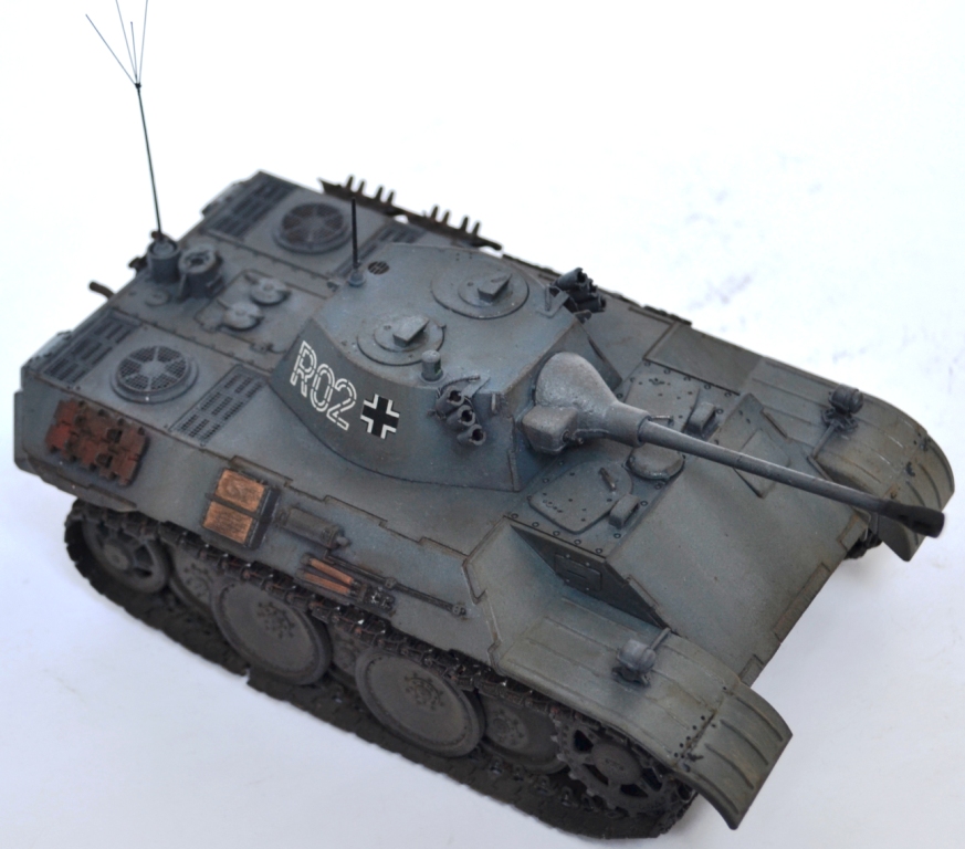 Разрешите представить вашему вниманию модель немецкого проектного/опытного легкого танка VK16.02, более известного как Leopard. Модель воспроизводит предполагаемую опытную машину, переданную для фронтовых испытаний в одну из танковых частей, в которой она использовалась как командирская машина. Соответственно, "обгадинг" полигонной машины невелик, а свеженанесенные тактические номера и опознавательные знаки еще не успели обтереться и испачкаться - по задумке, танк совсем недавно прибыл в часть. Временная привязка- осень 1942 года, когда предполагалось завершение работ над прототипом. Отсюда и окраска модели в стандартный на то время танковый серый.
