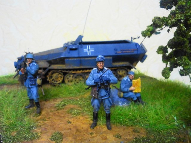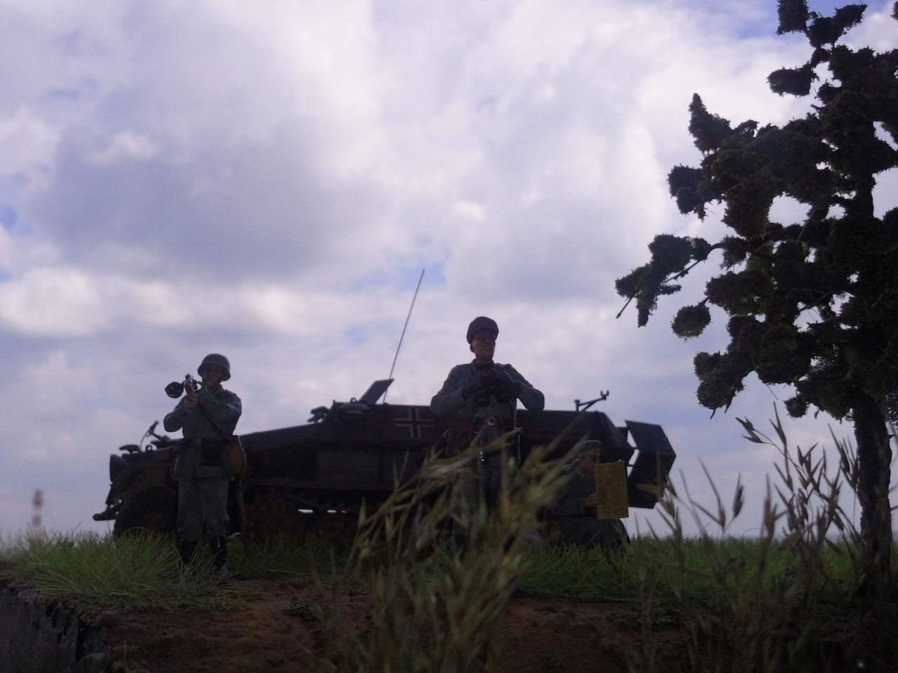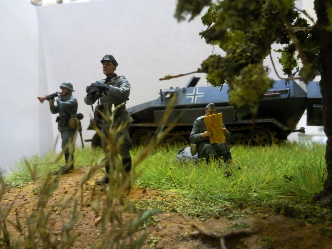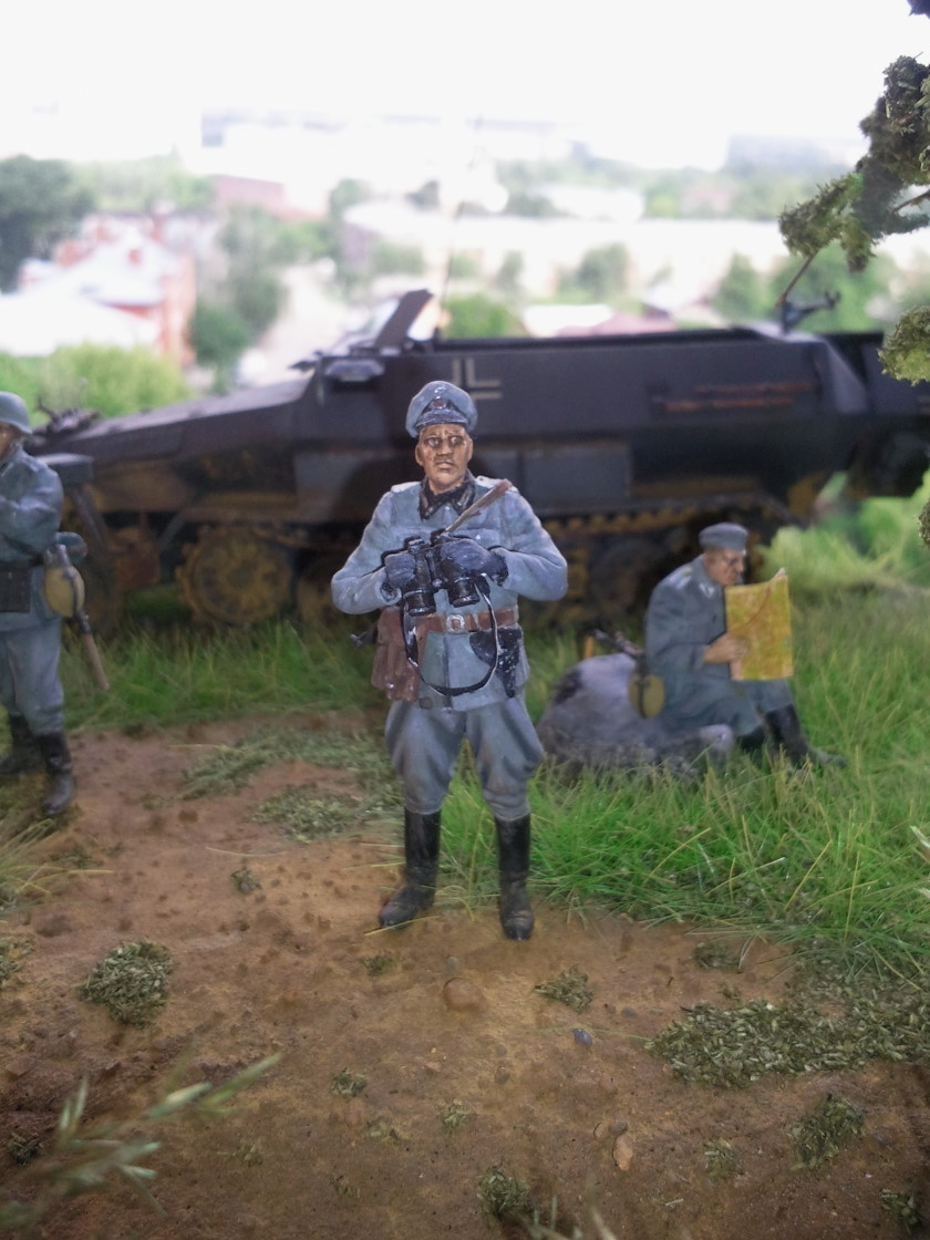 5.Сюжет должен нести какую-то идею,сюжет.ЧТО Вы хотели сказать своей работой?Три фрица бросили свой БТР и "валят" куда-то???Остановившись здесь,им безопаснее разглядывать местность и карту за бронёй,а не на лужайке.