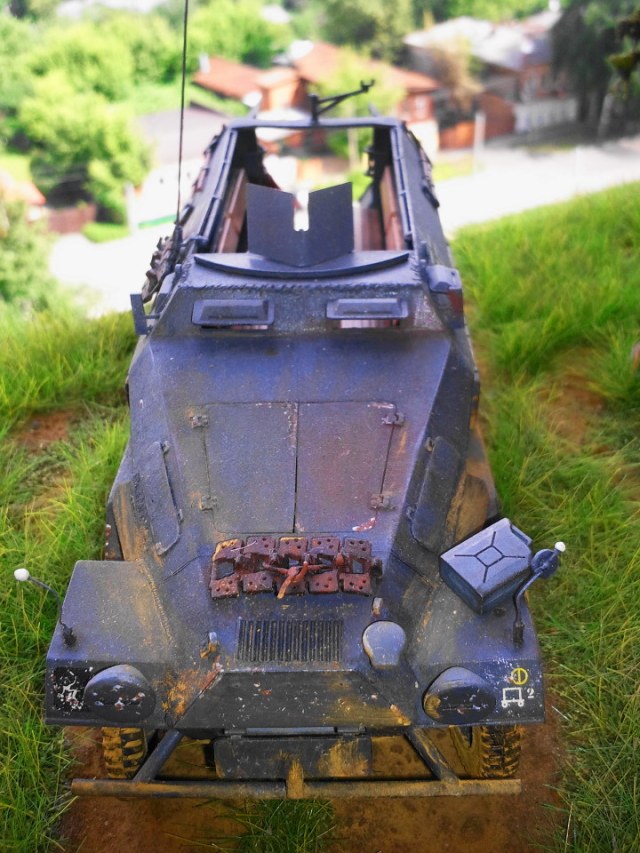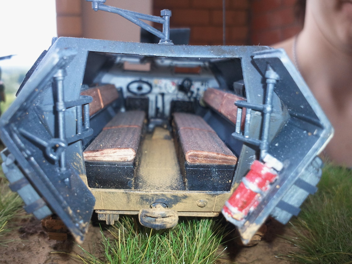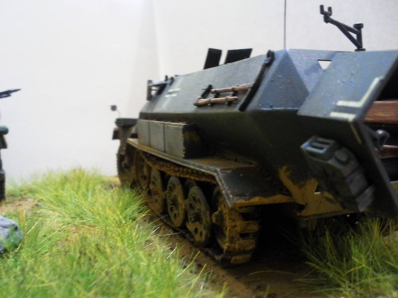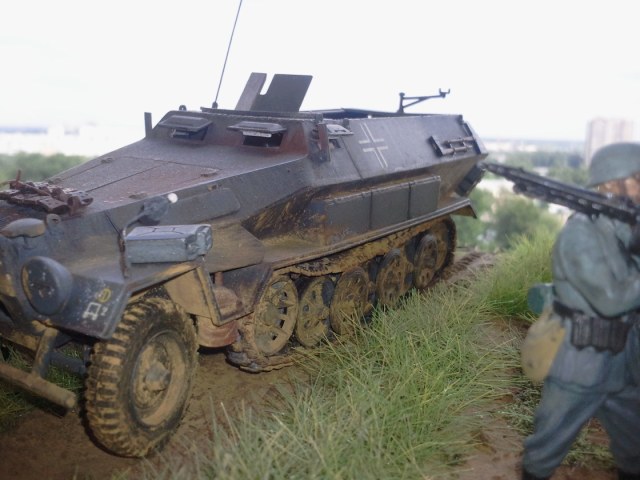 Добрый вечер всем! Представляю свою первую диораму. Фотки не очень, как только появится нормальный фотик- перефоткаю. Ну, немного о модели. Думаю, что рассказывать про ханомаг не стоит, все прекрасно знают эту модель от "звезды". Далась постройка этого крокодила не просто, в какой-то момент мне показалось, что я вообще не смогу его собрать. Про доработки: переделал скатку в кабине, добавил наушники на рацию, антенну сделал из гитарной струны, изготовил новые держатели для канистр на задних дверях.Изготовил зеркала заднего вида. Ну про постройку диорамы можно прочитать здесь. Красил аэрографом красками от тамии, ну и звезда конечно. Пигменты Миг. Всем приятного просмотра, конструктивная критика приветствуется.
