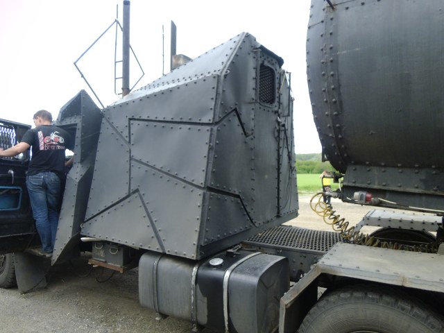 Видел нечто подобное в москве, на развязке новой риги и МКАДа, тоже сварное, тока чёрное, а там, где должен был быть седельный механизм - была платформа с бааалаьшим количеством колонок, громко и задорно играющим бодренький хэви) Тока это был не то КрАЗ, не ту Уральчик.