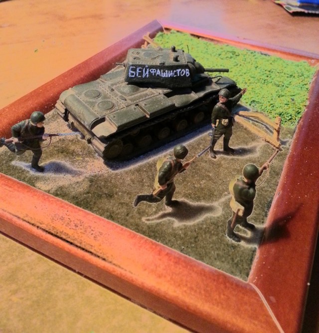 Моя первая диорамка. Основание - гипс, песок, модельная трава. Когда все сделал..понял что промохнулся с масштабом солдатиков, они должны быть немного поменьше)