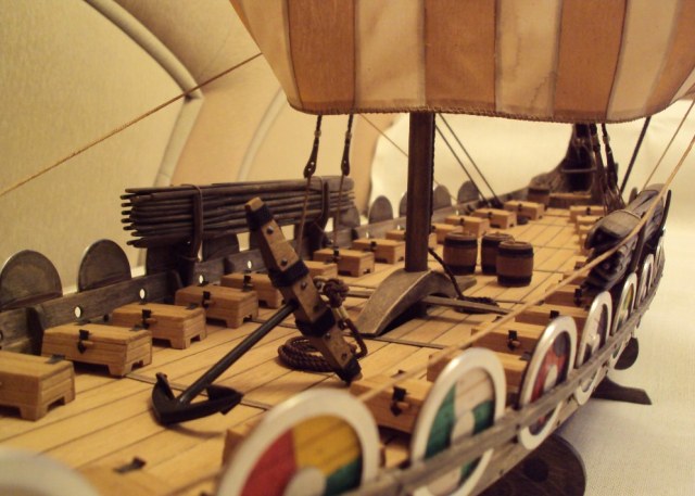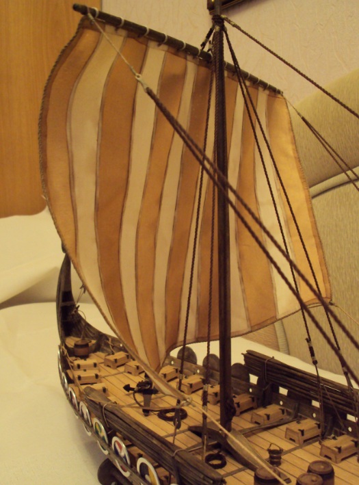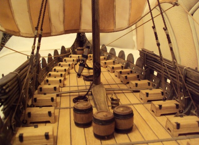 Доделаны многие элементы: ящики/сундуки, на которых сидели гребцы; якорь; бочки; ведро; парус; нити такелажа. Выполнены работы с корпусом, сделаны имитация шайб с внутренней стороны бортов. Окрашены и украшены щиты.