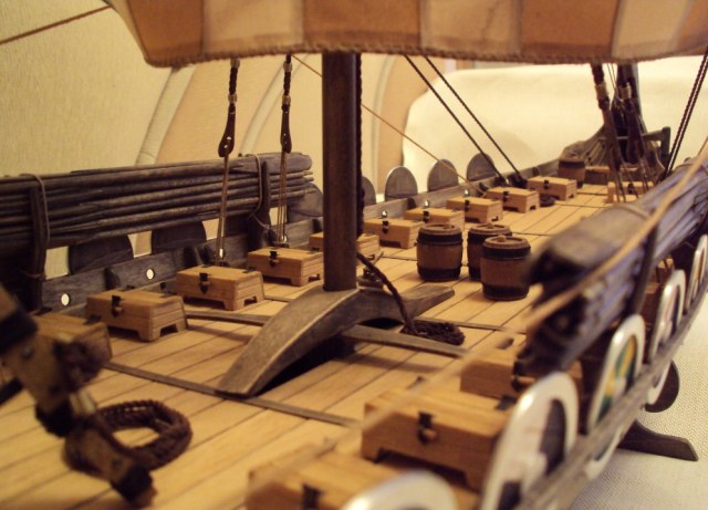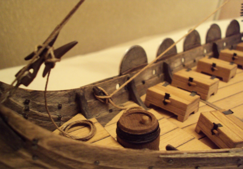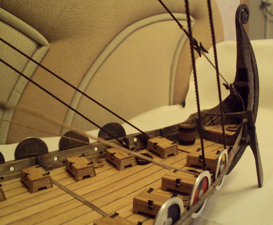 ...бросается в глаза неправильно сделанный пяртнерс мачты и упрощенный такелаж,ванты заведены на странное подобие блоков,это наверное фантазия авторов набора...как-то в Питер заходило несколько реплик судов викингов - там ванты и штаги крепились именно так как на картинках(пример),неявно выражен способ укладки досок палубного настила,на фото такое впечатление что поперечные рейки между бортовыми кницами просто лежат поверх настила палубы,а палуба настилалась между бимсами,в которых были сделаны специальные пазы...палуба слишком выбивается по своему новенькому виду от состаренного корпуса, нет резьбы ,довольно богатой на оригинале ...