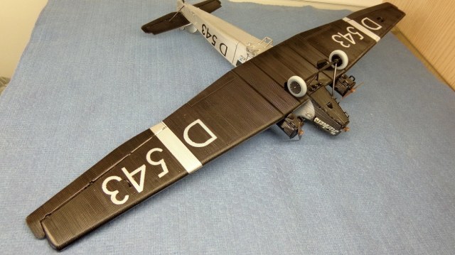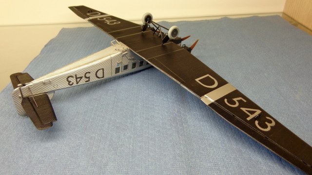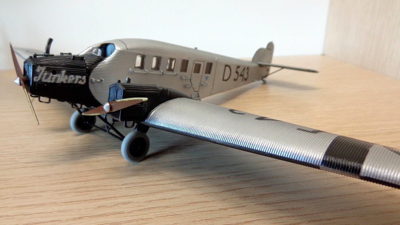 Теперь перейдем к модели. Ее я получил из Германской Демократической Республики, кажется в 1988-89г. Это получается 25 лет назад. Во как! Тысячу раз доставал из коробки отливки, вертел в руках, прикидывая как бы сделать из него бомбер, так как G23 в чистом виде в России не применялся. Достав в 1001-й раз (пару недель назад), подумал - а почему бы нет? Ведь летал же Арцеулов на нем(пусть и немного)! В некоторых статьях, рассказывающих о фирме-производителе модели говорилось что данная модель получила приз на какой-то престижной выставке. Пытаясь собрать модель, я подумал - за что же приз то? Создатели модели мне кажется ее и в руки никогда не брали. Стыкуемость деталей скверная, щели и "ступеньки" вылезают везде. Мелкие детали просто трескались в руках, то ли от старости, то ли материал такой. Задняя кромка на крыльях - просто ужас(я даже подумал: может профиль крыла такой дожен быть?). Глубокие же "перезапилы в поисках истины" не мой удел, так что "изкаропка" получилась вот такой. Есть одна доработка: в туалетный отсек поставил малюсенький унитаз с черной крышечкой. Окрашена модель эмалями "Тамии"-черной и серебром. Еще такой момент. Некотрые источники, в том числе и зарубежные указывают, что самолет имел российскую регистрацию R-RECL и мне конечно же хотелось сделать модель в таком виде. Но попытки найти такое фото не увенчались успехом. Но я нашел другое фото, где наш "герой" изображен вместе с тремя самолетами, готовящимися к групповому перелету Москва-Пекин-Токио. Самолеты стартовали утром 10.06.25. На самолете же нанесен немецкий номер D-543. А наносился ли вообще R-RECL? В общем после очередных "терзаний и метаний" сделал я модель как на этом фото. Номер накрашен при помощи скотча. Не совсем идеально получилось. Той легкости и удовольствия при сборке, что было недавно с двумя "ревелльскими" F-13, с этой моделью не было, но все-таки было интересно сделать и поставить на полку этот старенький, гофрированный "летающий автобус" Юнкерса.