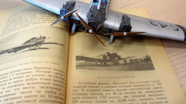 Р.S. В моей библиотечке сохранилась пожелтевшая брошюрка профессора Рынина "Аэропланы. Их усройство и т.д." 1925 года издания(!!!). На одной из страниц есть фото "Трех-моторный Юнкерс". Представьте, на момент появления книжонки этот самолет был новинкой, последним достижением науки и техники!