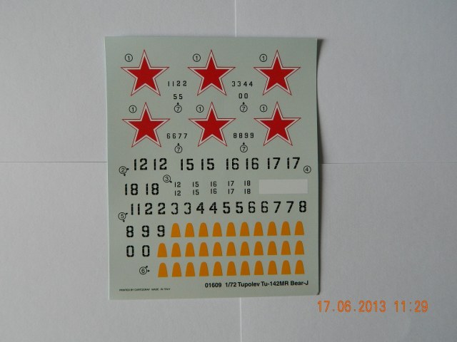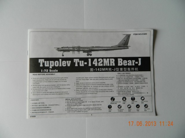 Качество пластика на высоте, замечаний вообще нет.Инструкция хорошо читаемая в виде книги, в 12 шагов сборки на 12-ти страницах.Лист декалей будет по беднее не много,по размеру большие только звёзды,остальное маленькое всё.В целом всё на отлично.Тоже как и с Ту-160 со стройкой придёться подождать ,т.к. ищу место под него.