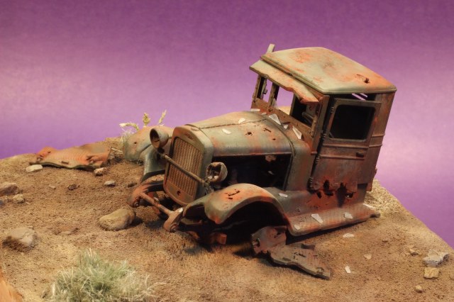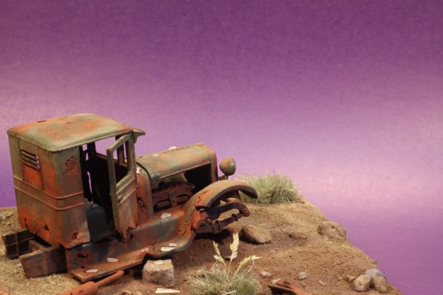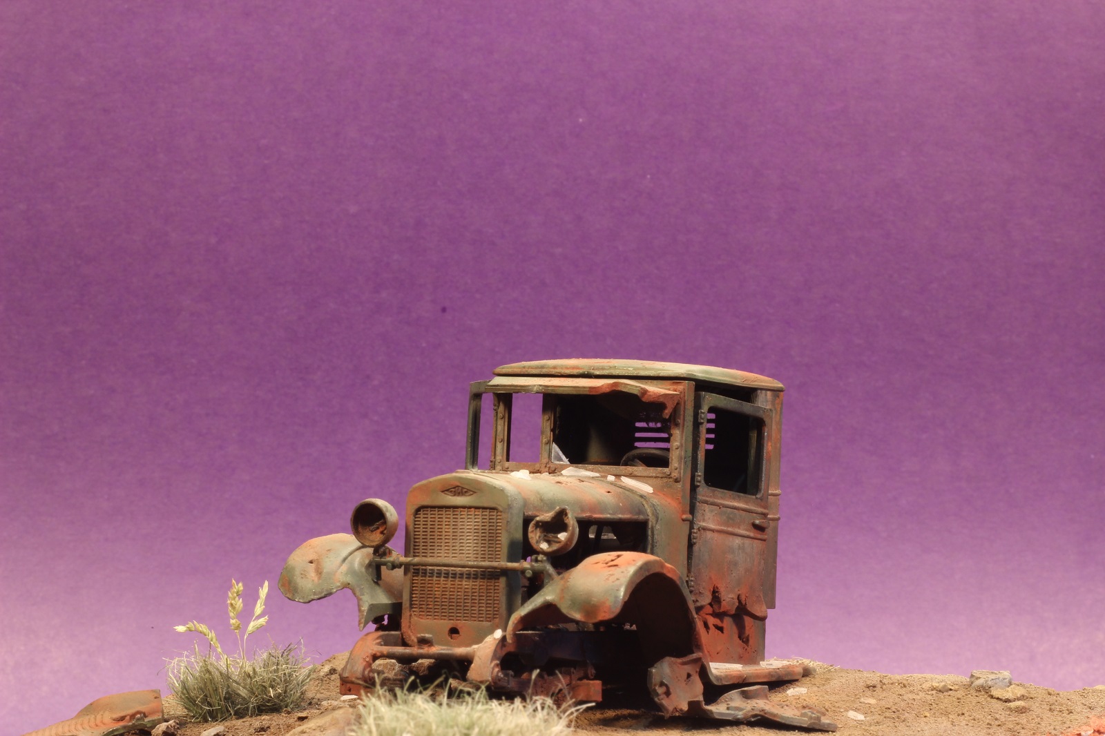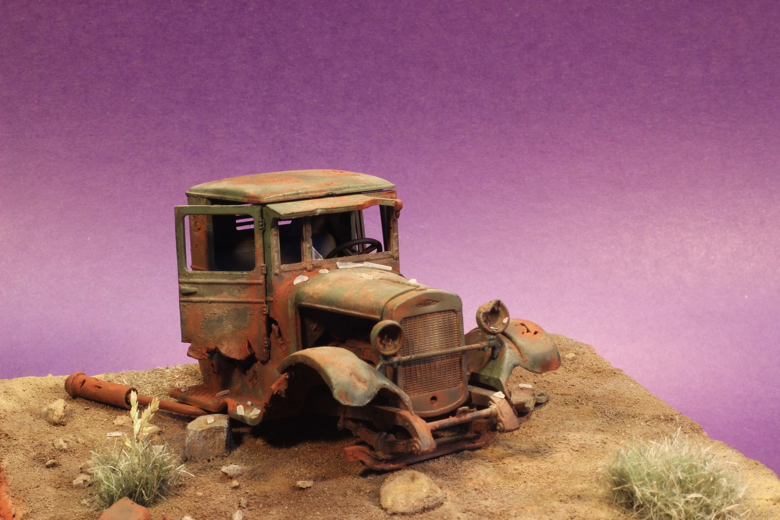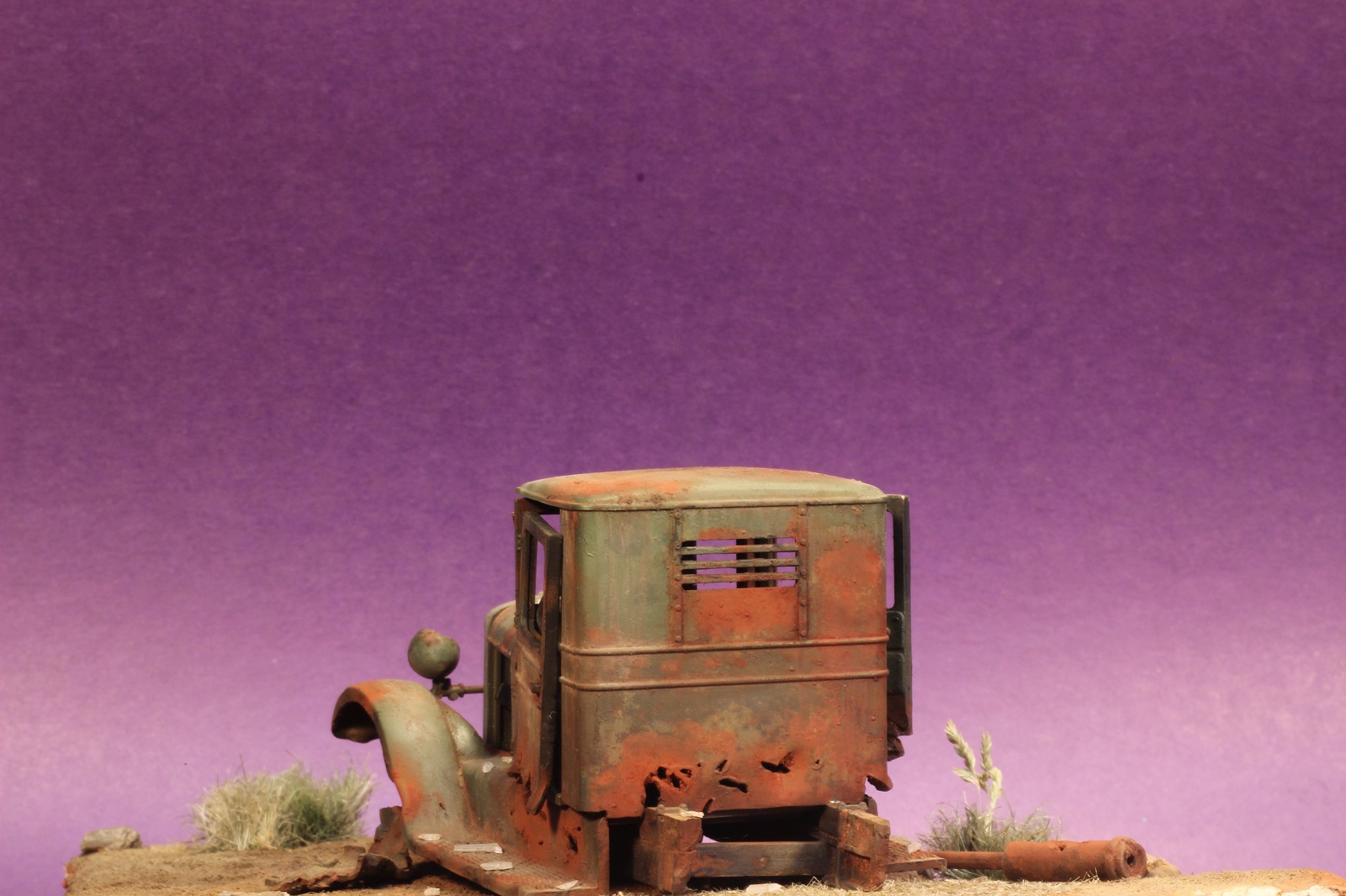 Очень хорошая идея и неплохое исполнение! Всё же заметна толщина мятых деталей - козырёк кабины, двери. Эти элементы стоило из фольги делать. Крыша кабины ржавой быть не могла - она дермантиновая.Ручки дверей можно было и самому сделать.