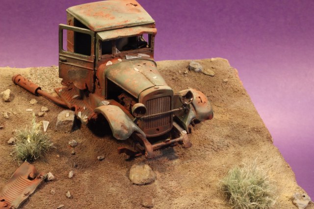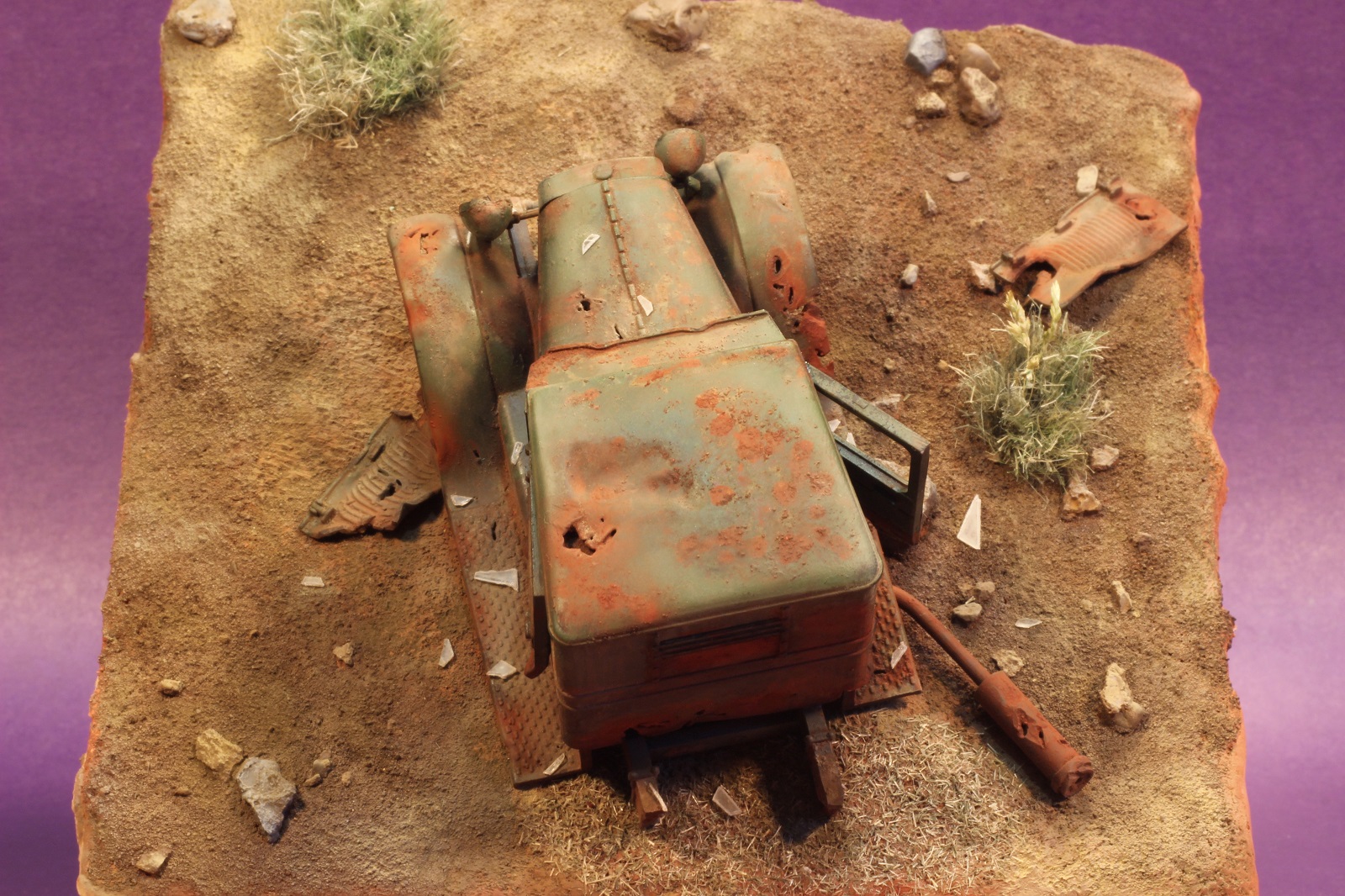 Всем доброго времени суток! Представляю вашему вниманию свою работу. Кит от ARK-models, качеством меня не порадовал, всё весьма криво и уныло. Долго не думая, решил собрать кабину и потренироваться на ней в технике жёсткого везеринга, с последующем изготовлением небольшой диорамы. По модели: повреждения кузова делал паяльником, окраска эмаль тамия, фильтр, смывка и сколы худ. масло, так же для имитации старения- использовал соль, использовал пигменты "мастер пигмент". Имитировал проводку фар проволкой и обивку потолка из чайного пакетика. По основанию: кусок XPS взят за основу, имитация поверхности земли из худ. глины + песок, испитый кофе и камушки разной фракции. Окраска- эмаль от тамии, пылил пигментами "мастер пигмент", трава - сан.тех. лён разого "калибра".
