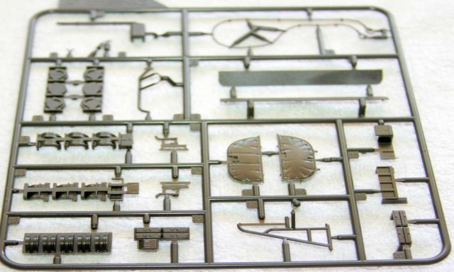 Внутри- корпус из двух частей и рама,семь литников защитного цвета,литник с прозрачными деталями,колеса и небольшая плата фототравления. Большая декаль на два варианта плюс внутреннюю часть салона предполагается с помощью декали закамуфлировать.