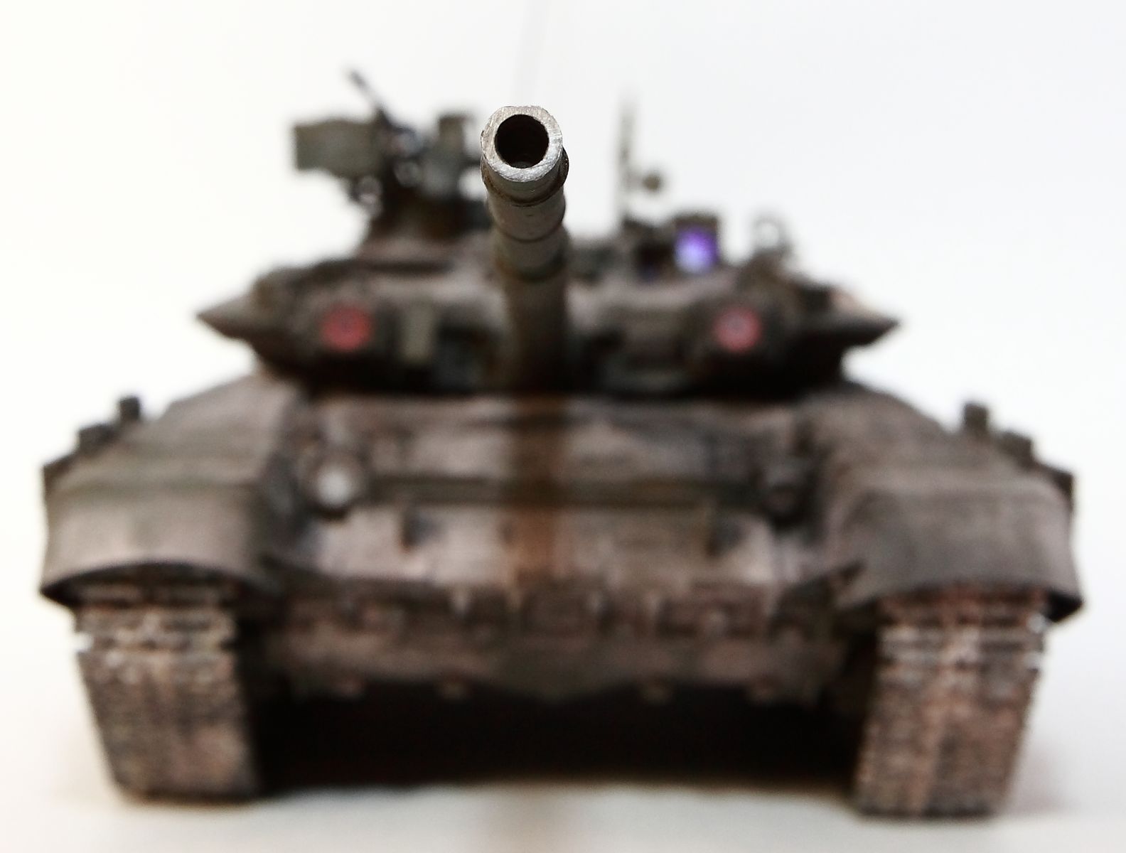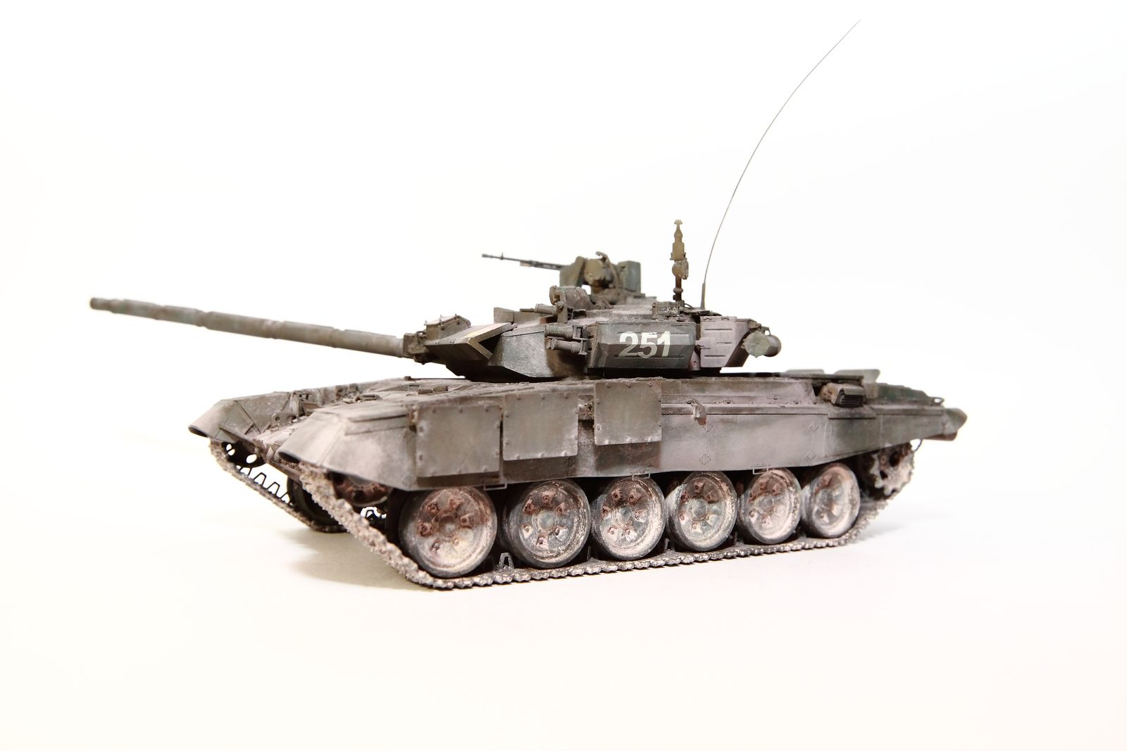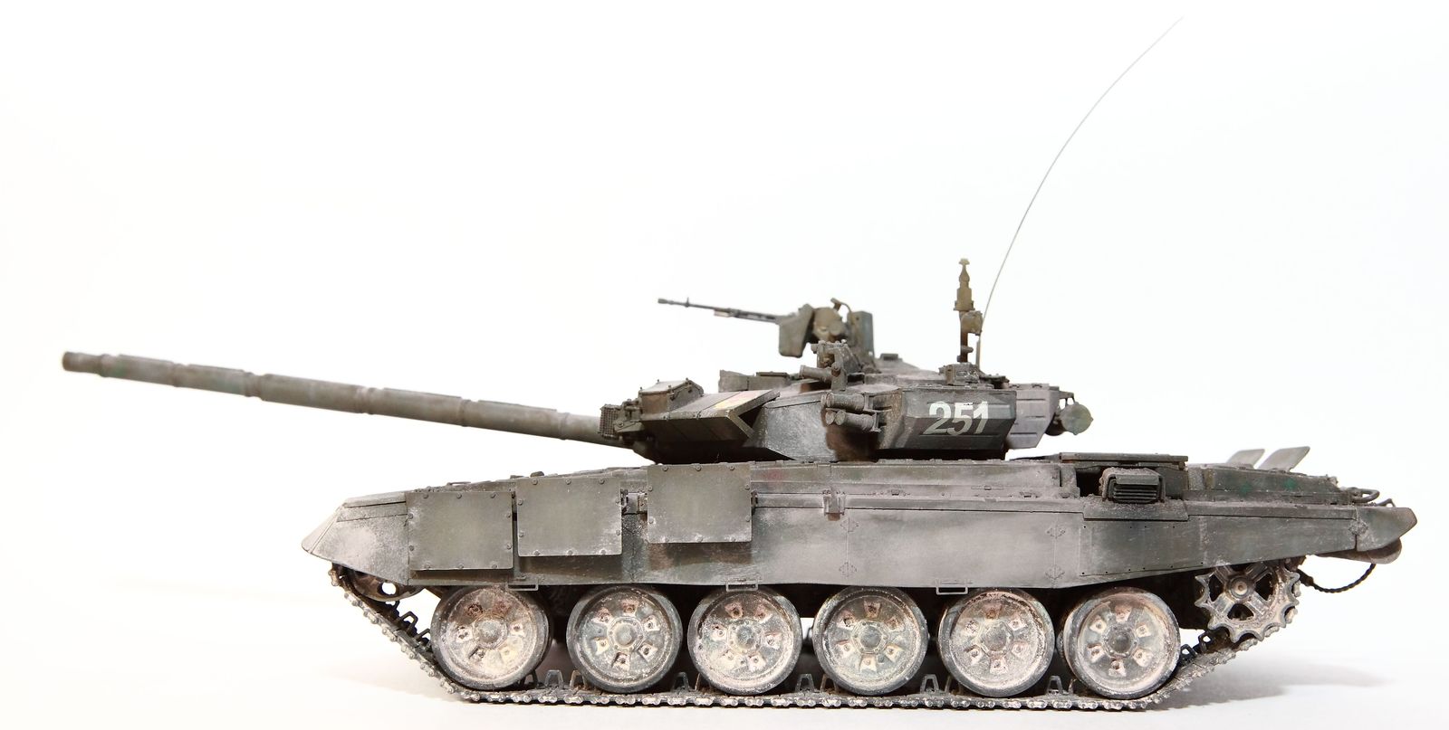 Российский основной боевой танк Т-90 был разработан в 1989 году в конструкторском бюро нижнетагильского «Уралвагонзавода» как очередная модификация Т-72 (Т-72БУ). В 1993 году он был принят на вооружение под индексом Т-90. Танк вооружён гладкоствольной 125-мм пушкой 2А46М повышенной точности. Орудие позволяет вести огонь не только различными типами снарядов, но и управляемыми по лазерному лучу ракетами. Применение автомата заряжания позволило достичь скорострельности до 7-8 выстрелов в минуту, что выгодно отличает Т-90 от большинства зарубежных танков. Т-90 может стрелять не только по любым наземным целям, но и по низколетящим самолетам и вертолётам противника. Возможности орудия и новейший прицельный комплекс 1А45Т «Иртыш» позволяют уничтожить любой самый современный танк противника ещё до того, как он приблизится на расстояние эффективной стрельбы из своей пушки. Вспомогательное вооружение состоит из спаренного с пушкой 7,62-мм пулемёта ПКТМ и дистанционно наводимого 12,7-мм зенитного пулемёта 6П49 «Корд» на башне. Собственная защита танка обеспечивается применением активной брони и новейшего комплекса оптико-электронного подавления «Штора-1».