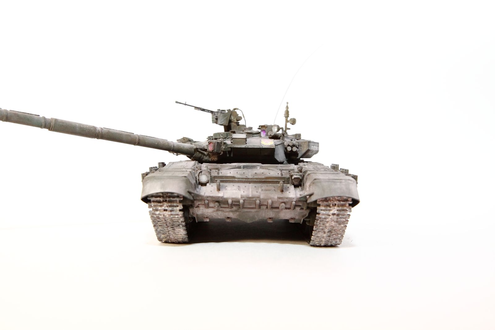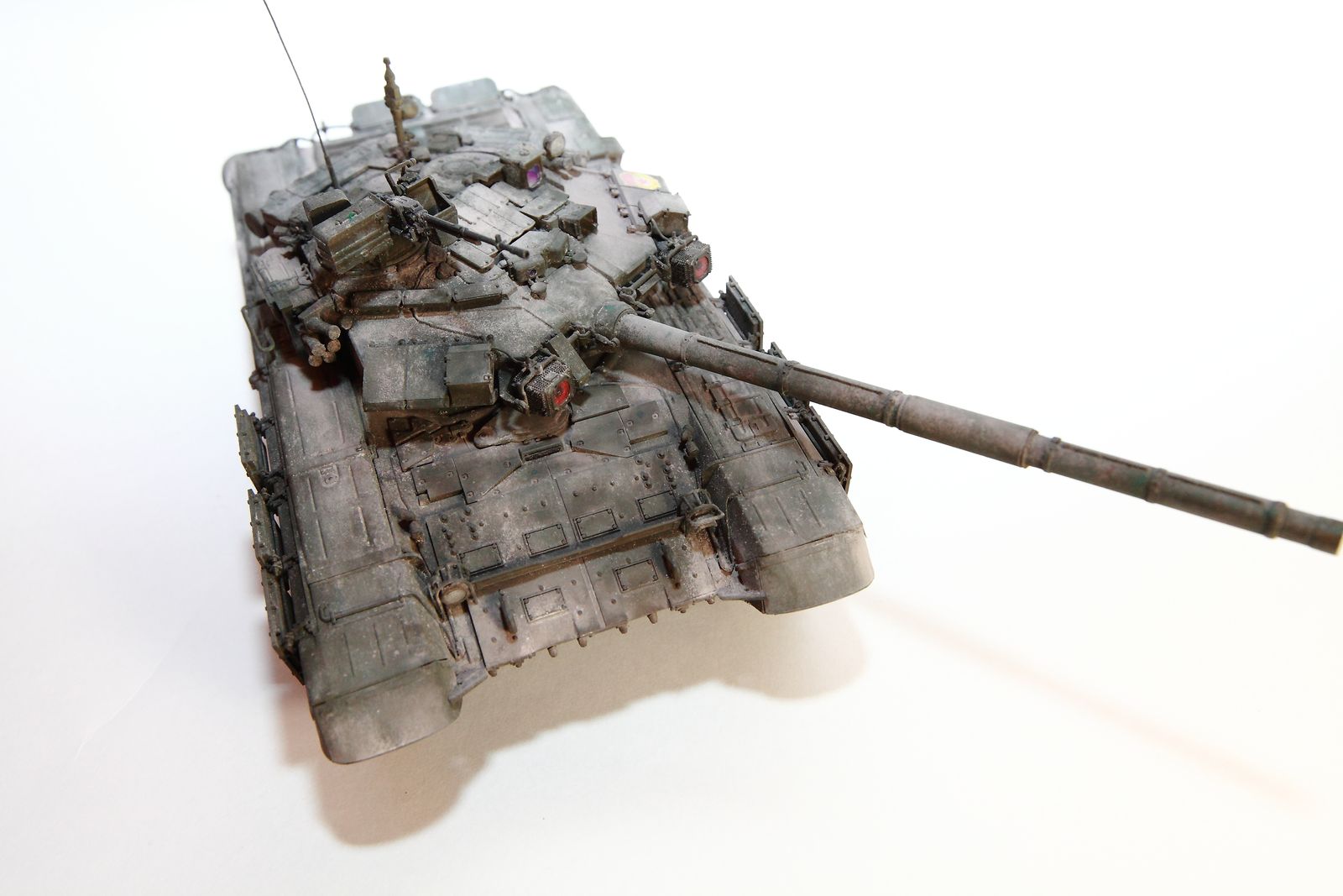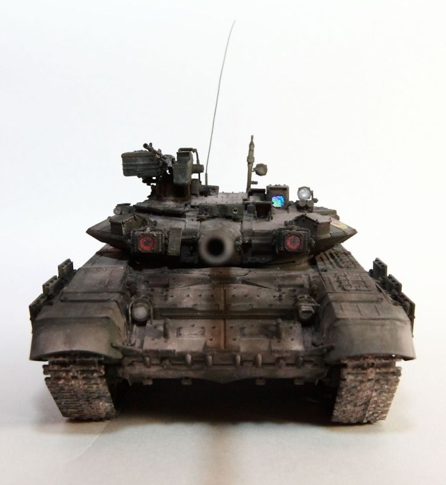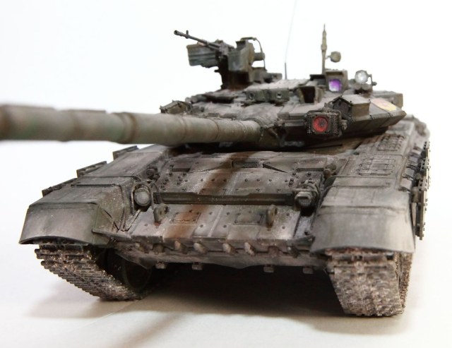 Российский основной боевой танк Т-90 был разработан в 1989 году в конструкторском бюро нижнетагильского «Уралвагонзавода» как очередная модификация Т-72 (Т-72БУ). В 1993 году он был принят на вооружение под индексом Т-90. Танк вооружён гладкоствольной 125-мм пушкой 2А46М повышенной точности. Орудие позволяет вести огонь не только различными типами снарядов, но и управляемыми по лазерному лучу ракетами. Применение автомата заряжания позволило достичь скорострельности до 7-8 выстрелов в минуту, что выгодно отличает Т-90 от большинства зарубежных танков. Т-90 может стрелять не только по любым наземным целям, но и по низколетящим самолетам и вертолётам противника. Возможности орудия и новейший прицельный комплекс 1А45Т «Иртыш» позволяют уничтожить любой самый современный танк противника ещё до того, как он приблизится на расстояние эффективной стрельбы из своей пушки. Вспомогательное вооружение состоит из спаренного с пушкой 7,62-мм пулемёта ПКТМ и дистанционно наводимого 12,7-мм зенитного пулемёта 6П49 «Корд» на башне. Собственная защита танка обеспечивается применением активной брони и новейшего комплекса оптико-электронного подавления «Штора-1».