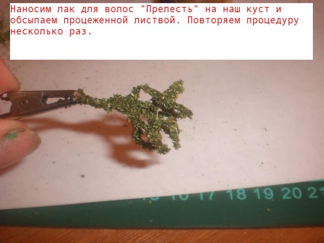 Вы сделали только 1 ветку от куста, сделайте 5-7 таких веток Соедините их воедино, окрасьте их в разные оттенки коричневого,задуйте лаком для волос и НЕ обсыпайте, о тыкайте в ту смесь, так как не на всей поверхности ветки растут листья, будут вопросы пишите в ЛС.
