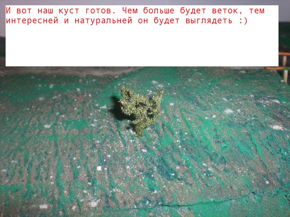 ничего нового по технологиям + при данном изготовлении ствол желательно перед обсыпкой покрыть , хотя бы шпаклевкой, для имитациеи коры и окрасить. Именно из отсутсвия в вашем изготовлении последних пунков куст и выглядит не совсем естественно.
