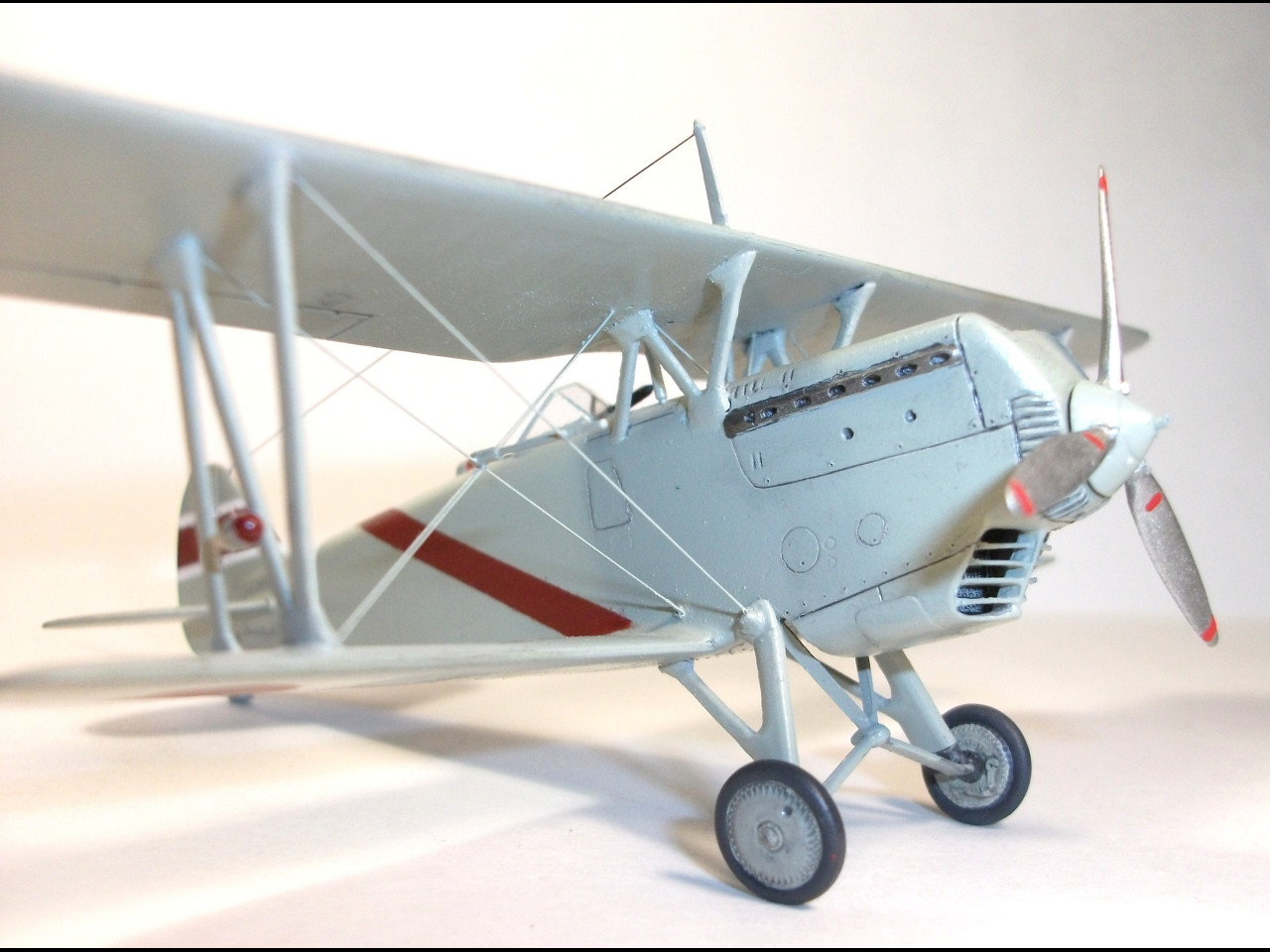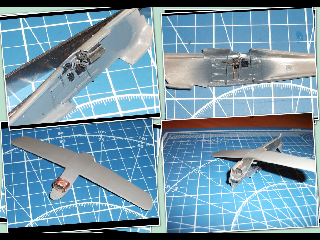Собиралась модель достаточно легко, проблема была только в подгонке крайних стоек крыльев. Доработок коснулись: кабина, створки жалюзи и колеса. В кабину добавил силовой набор, сделано новое кресло пилота с ремнями, приборы на бортах, педали. Срезаны створки и сделаны новые в открытом положении.Сделал также масляный радиатор. На дисках колес сделаны тяги тормозов. Выточены из цветных зажигалок АНО, сделана ПВД. Расчалки и антенна традиционно из швейной мононити. Рассверлены патрубки. Родной козырек был потерян, поэтому пришлось сделать новый из прозрачного пластика. С углом установки прицела вышла конфузия. При приклеивании козырька в отверстие попал супер-клей и установить его нормально уже стало невозможно.