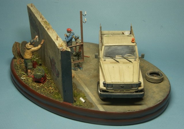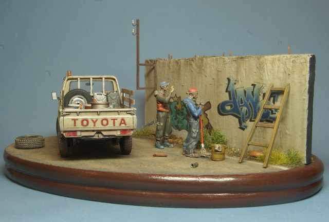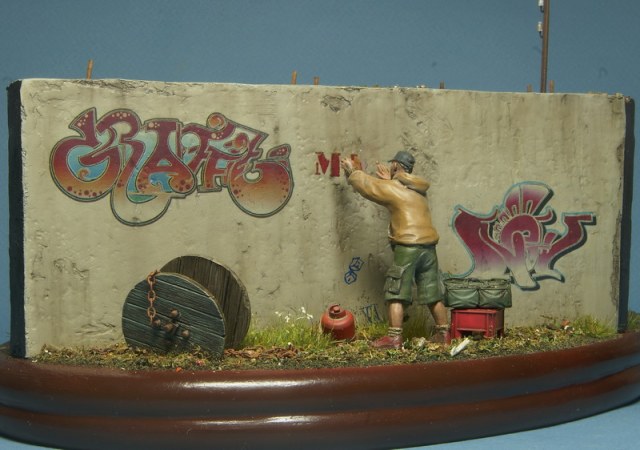Всё очень отлично! и очень очень здорово вышло!!!!!! не к чему придратся! но есть одна за доренка, она сути ни как не миняет!!!!)))))) но всё же.. райдер, тоисть тот кто рисует графити в данный момент в диорамке буквы которые он начал рисовать М и А без трафарена он не нарисует так)))) по этому можно было бы в руке ему вставить замазаный красной краской маленький бумажный квадрати!!)))) и будет супер!