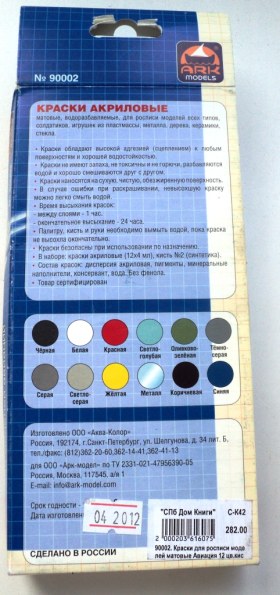 Акриловые краски ARK Models были куплены мной как раз в отпуске в Доме Книги Санкт Петербурга за 282 рубля.