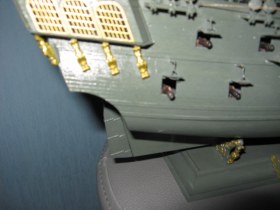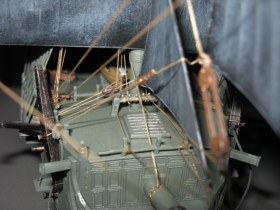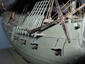 Парусники,старинные,пусть даже и вымышленные имеют свою прелесть.А именно неоднородность колеров.Даже доски обшивки и палубы ,лежащие рядом имеют разный оттенок,потому что дерево ЖИВОЕ.А что здесь?ВСЕ в том числе и такелаж и рангоут окрашено в замечательный тот самый серо-оливковый цвет,который стараются поймать любители флота ЕИВ в РЯВ.Медные лафеты пушек из области бреда.И в тоже время видно,что автор владеет кистью и красками.Шлюпка,корма и стволы тех же пушек обработаны красочкой на зависть.Может корма немного ярковата только,но тщательно.