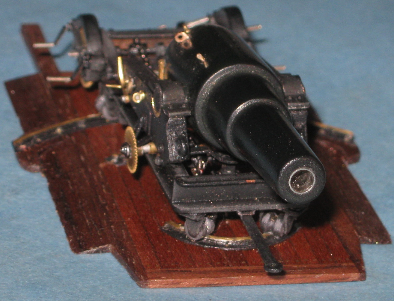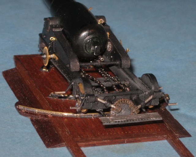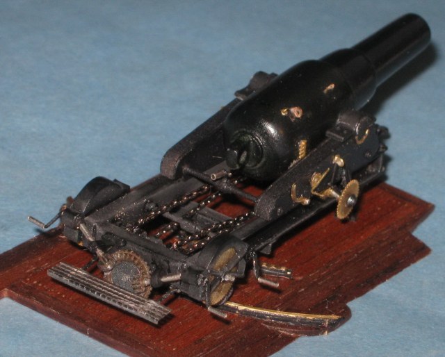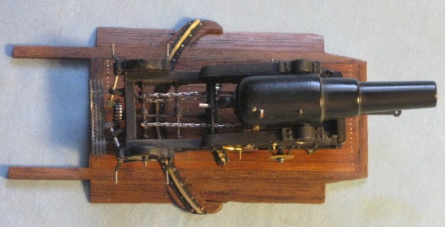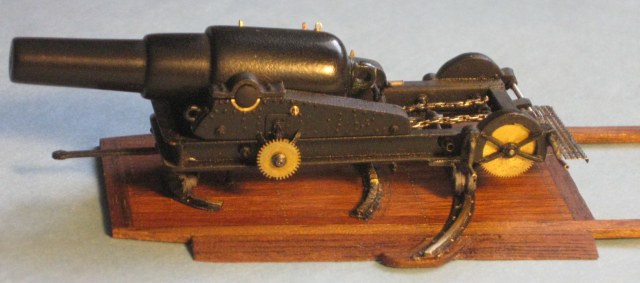 Я с трудом утвердился во внешнем виде этого девайса.потому как инфа есть,но уж очень разнообразная.Ощущение,что из стандартизации был только калибр и снаряды с ведущими сухарями.Где то рычаг справа,где-то слева,где-то с обоих.Тоже с прицельными приспособлениями,накатными механизмами/где-цепь,где тросовый полиспаст/,тоже с инструментами наводки...Нет уж.Историческими изысканиями заниматься не расположен.Остановился на одном изображении/тем более,что оно в чертежах самой канонерки/ и сделал.