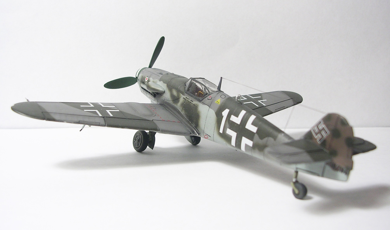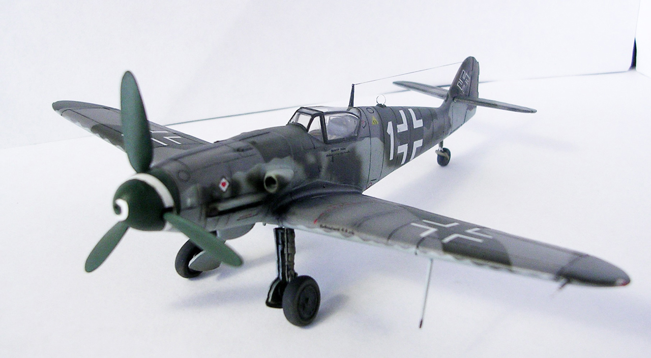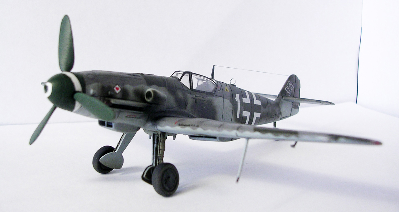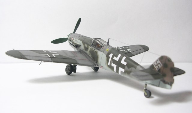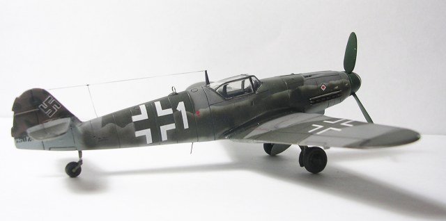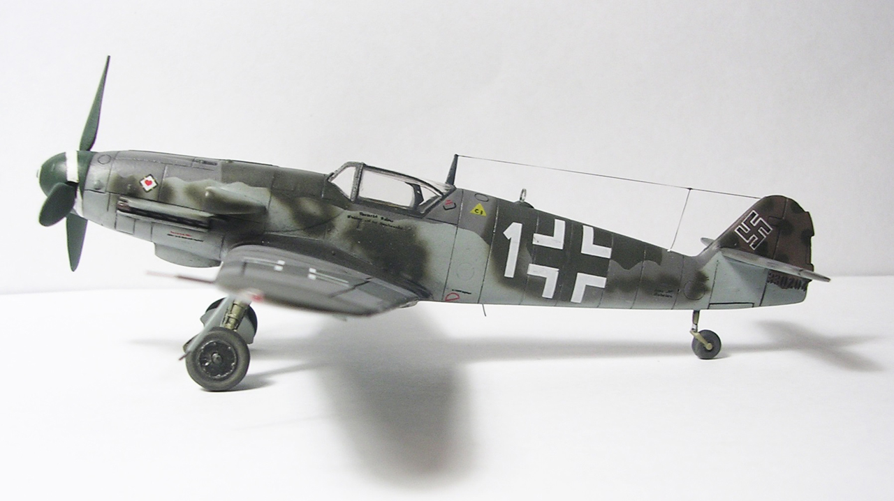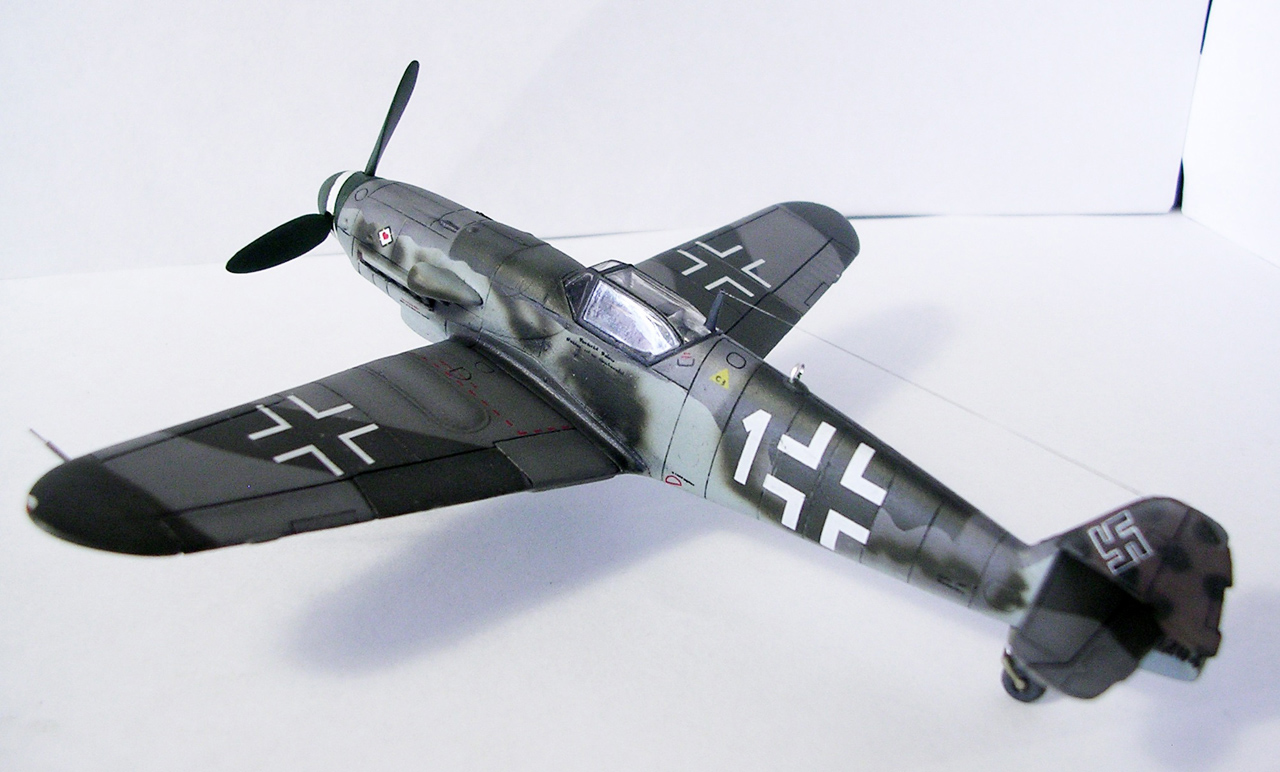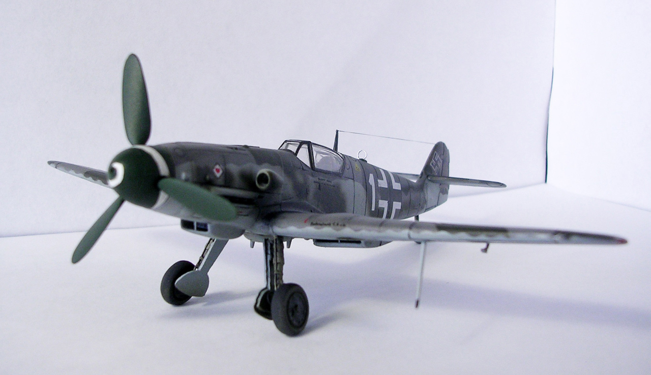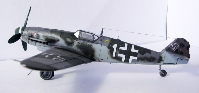 Здравствуйте,представляю свою очередную модель.Давно хотел собрать Bf.109 в своей последней серийной модификации,Долго выбирал из чего строить:отдавать больше 1000 р. за без сомнения замечательную модель от Fine Molds я пока не готов,приобрёл К4 от AML,но качеством остался не очень доволен(по моему мнению не стоит он своих денег) и решил рискнуть построить К4 от Амодел.Всё оказалось не так уж и страшно,несмотря на то,что на литниках всё выглядит довольно удручающе(облой,бугры и шагрень на внешних поверхностях,вся мелочёвка оплывшая и утонувшая в литниках) ,собирается всё это дело не так уж и плохо,главное подогнать аккуратно при склейке,особенно стыки деталей,действительно много шпаклёвки понадобилось только на стыке центроплана и нижней части фюзеляжа,на верхней части шпаклёвки не понадобилось вовсе,щели убрал подклейкой тонкого пластика.Кое где убрал лишние линии расшивки(это идёт ещё от модели Heller,перешитой копией которого и является Амодел) и нарезал недостающюю.Сделал совок маслорадиатора из тонкого пластика,поперечины в масло- и водорадиаторы,из тонкого пластика и тянутых литников добавил деталировки в ниши шасси,пвд из игл от шприцев,пулемёты из тянутых литников,кок винта от 109Ф4 того же Амодел(там их в наборе 3 штуки),подкрыльевая антенна FuG16 из набора Academy,откидная часть фонаря из набора,а козырёк от Hobby Boss(родной представляет собой бесформенный кусок пластика),БАНО из прозрачного пластика,держатель ПТБ из запасов(не помню уже от какой модели),антенна РПК в верхней части фюзеляжа:основание выточил из родного,рамка из фольги,тросовая антенна нить Хобби +,добавил шланги на стойки шасси,в кабину только бросил ремни на кресло и чуть доработал приборку,прорезал гильзосбросы в нижней части фюзеляжа.Красил эмалями Акан,декали от модели AML,расшивку выделял масляной краской на Уайт спирите,чуть попачкал тамиевскими пудренницами и Smoke,финишное покрытие матовый лак Microscale/