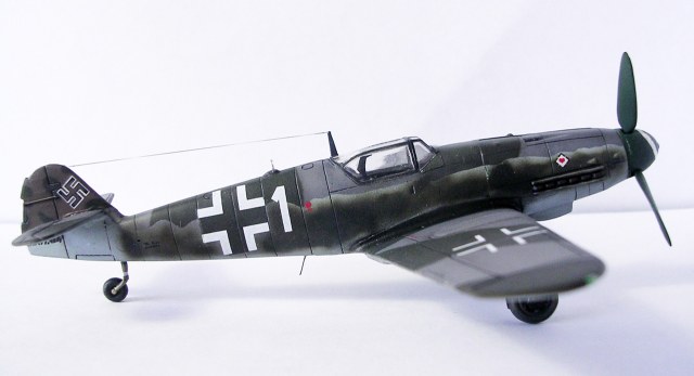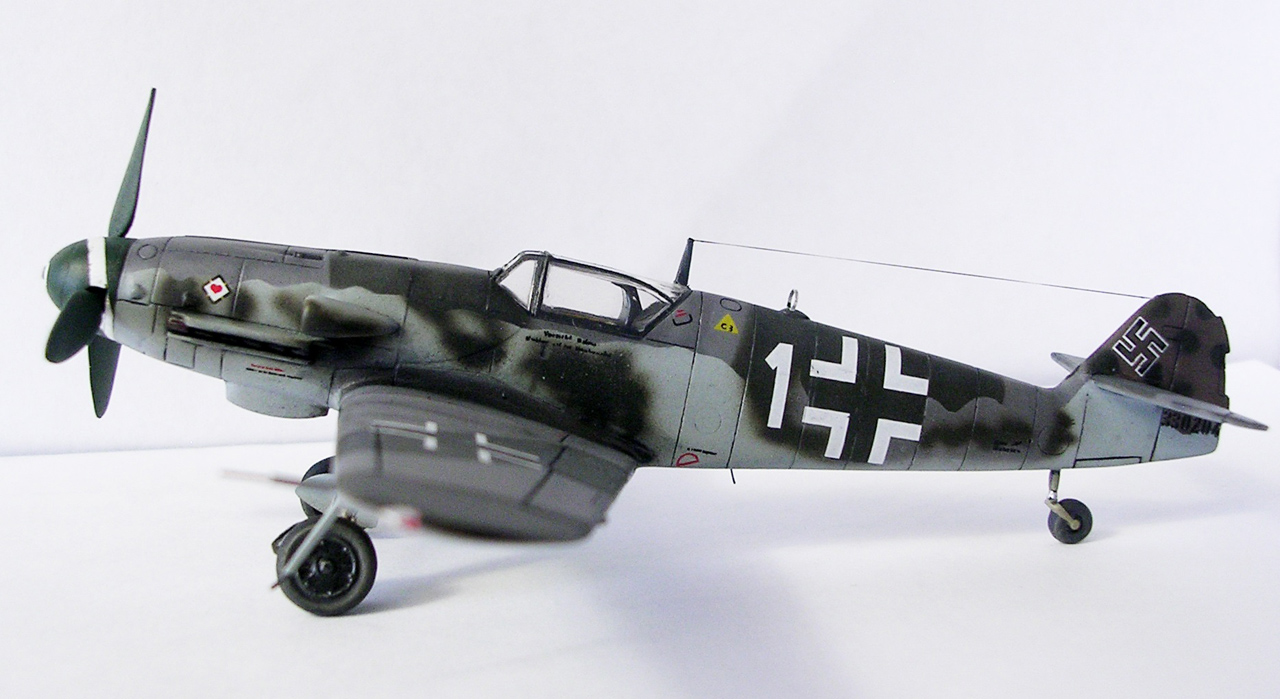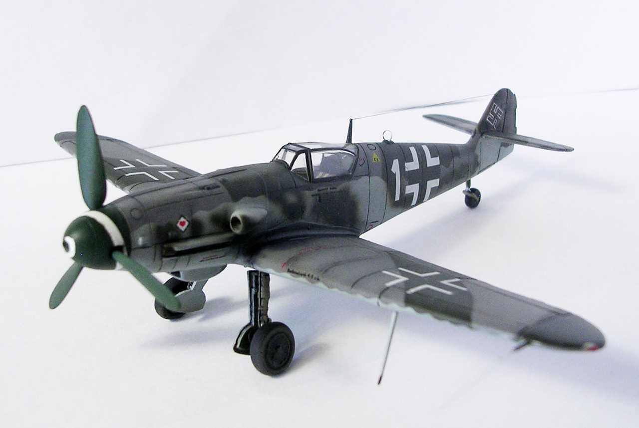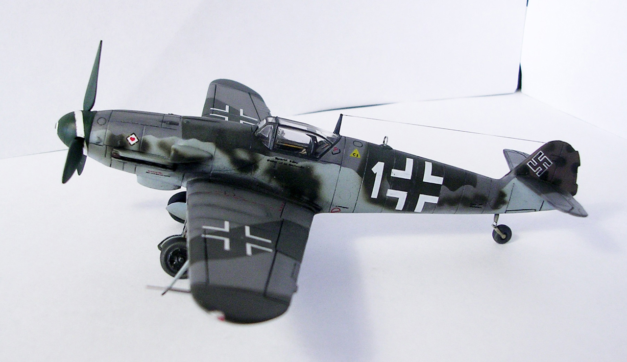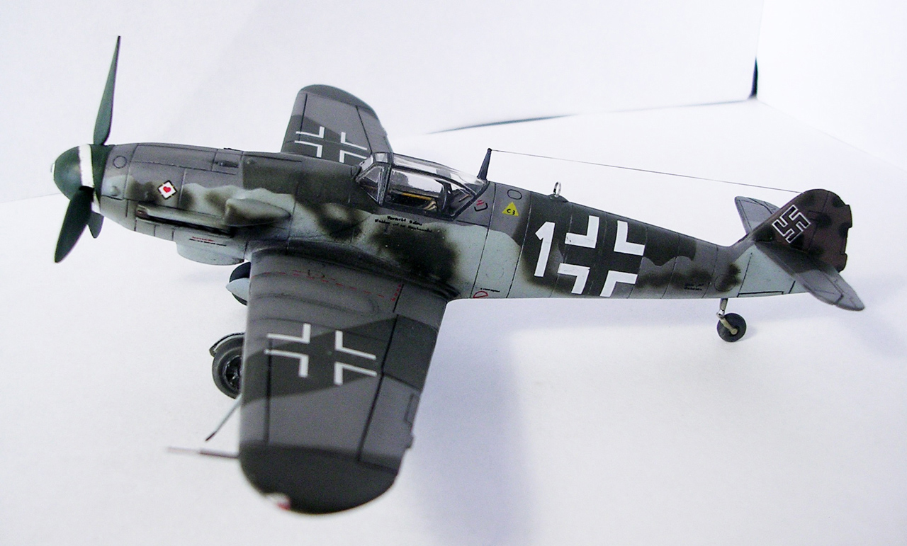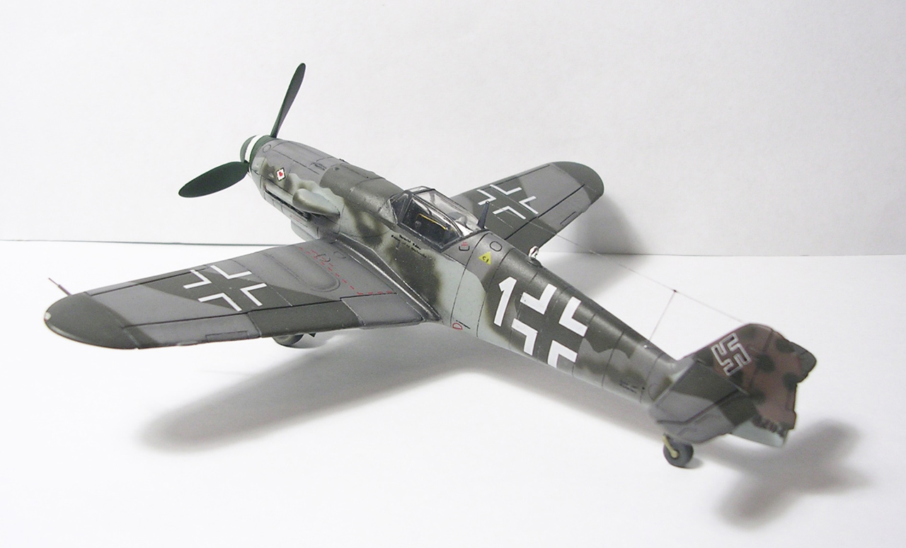 Здравствуйте,представляю свою очередную модель.Давно хотел собрать Bf.109 в своей последней серийной модификации,Долго выбирал из чего строить:отдавать больше 1000 р. за без сомнения замечательную модель от Fine Molds я пока не готов,приобрёл К4 от AML,но качеством остался не очень доволен(по моему мнению не стоит он своих денег) и решил рискнуть построить К4 от Амодел.Всё оказалось не так уж и страшно,несмотря на то,что на литниках всё выглядит довольно удручающе(облой,бугры и шагрень на внешних поверхностях,вся мелочёвка оплывшая и утонувшая в литниках) ,собирается всё это дело не так уж и плохо,главное подогнать аккуратно при склейке,особенно стыки деталей,действительно много шпаклёвки понадобилось только на стыке центроплана и нижней части фюзеляжа,на верхней части шпаклёвки не понадобилось вовсе,щели убрал подклейкой тонкого пластика.Кое где убрал лишние линии расшивки(это идёт ещё от модели Heller,перешитой копией которого и является Амодел) и нарезал недостающюю.Сделал совок маслорадиатора из тонкого пластика,поперечины в масло- и водорадиаторы,из тонкого пластика и тянутых литников добавил деталировки в ниши шасси,пвд из игл от шприцев,пулемёты из тянутых литников,кок винта от 109Ф4 того же Амодел(там их в наборе 3 штуки),подкрыльевая антенна FuG16 из набора Academy,откидная часть фонаря из набора,а козырёк от Hobby Boss(родной представляет собой бесформенный кусок пластика),БАНО из прозрачного пластика,держатель ПТБ из запасов(не помню уже от какой модели),антенна РПК в верхней части фюзеляжа:основание выточил из родного,рамка из фольги,тросовая антенна нить Хобби +,добавил шланги на стойки шасси,в кабину только бросил ремни на кресло и чуть доработал приборку,прорезал гильзосбросы в нижней части фюзеляжа.Красил эмалями Акан,декали от модели AML,расшивку выделял масляной краской на Уайт спирите,чуть попачкал тамиевскими пудренницами и Smoke,финишное покрытие матовый лак Microscale/