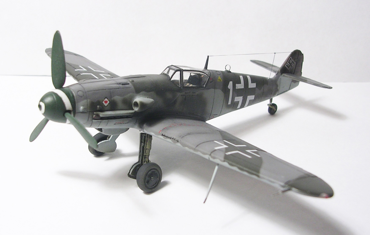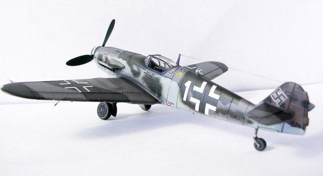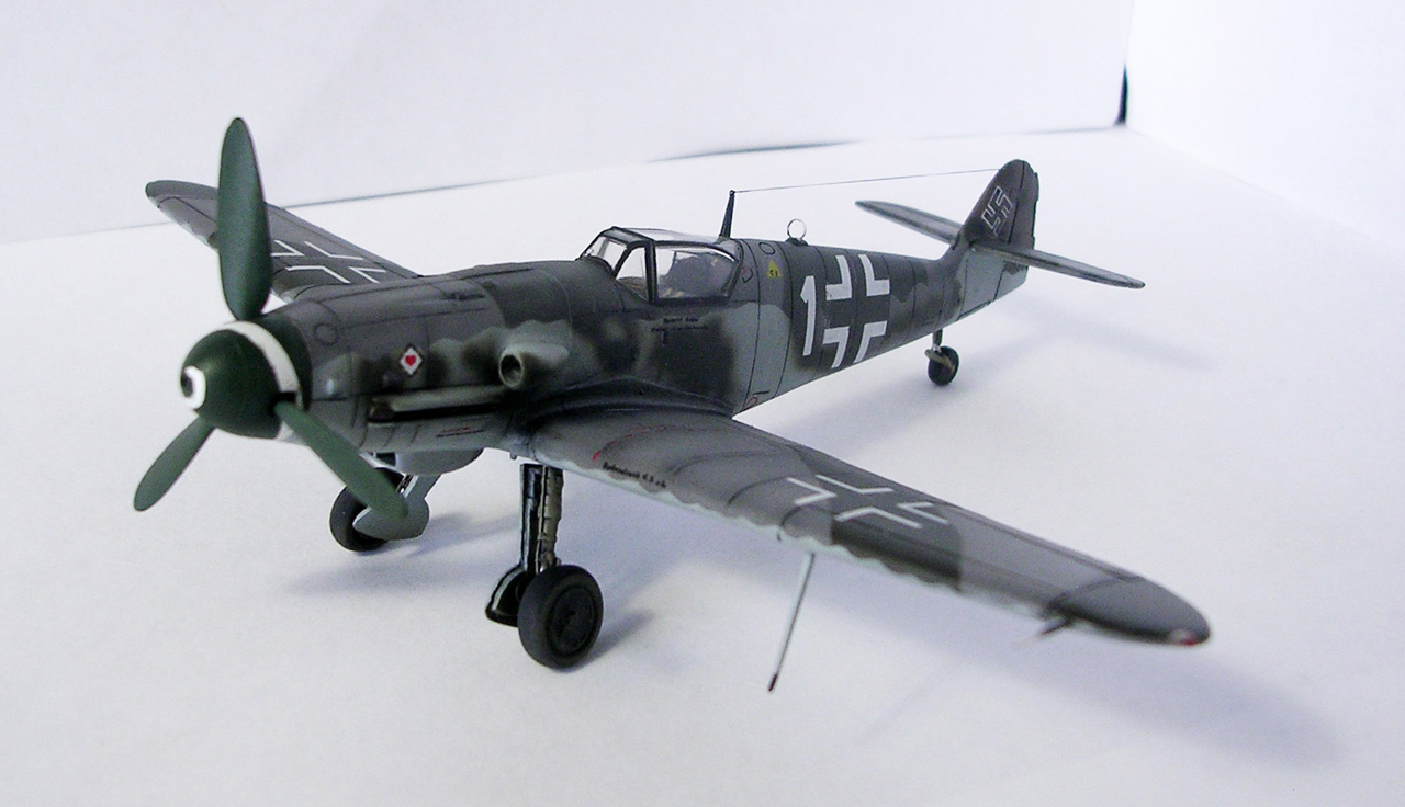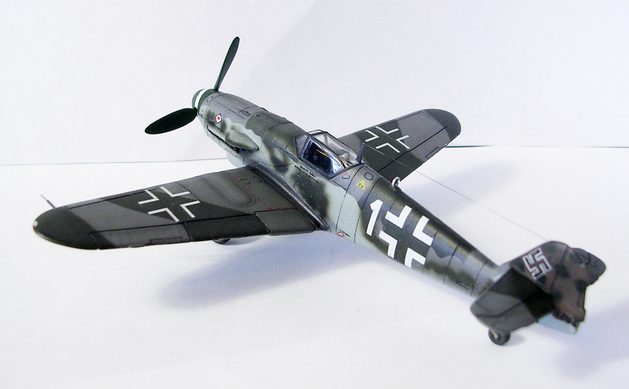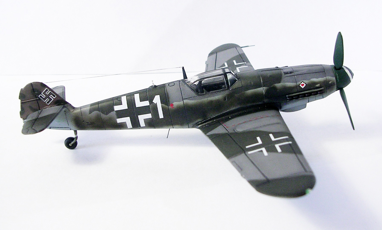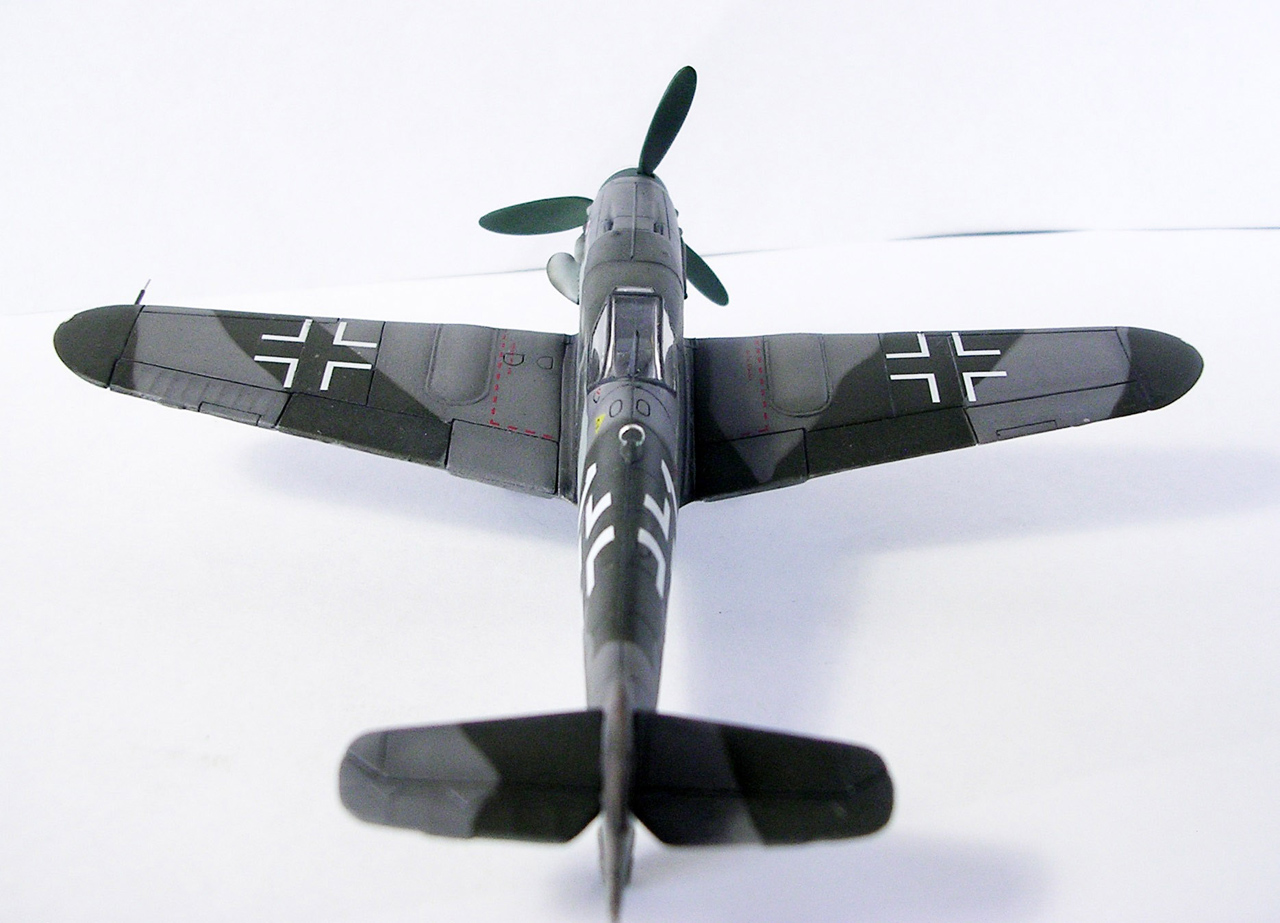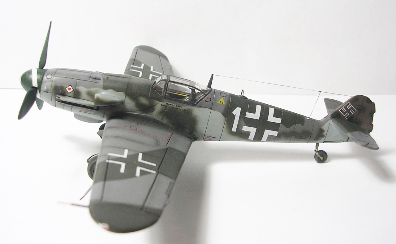Здравствуйте,представляю свою очередную модель.Давно хотел собрать Bf.109 в своей последней серийной модификации,Долго выбирал из чего строить:отдавать больше 1000 р. за без сомнения замечательную модель от Fine Molds я пока не готов,приобрёл К4 от AML,но качеством остался не очень доволен(по моему мнению не стоит он своих денег) и решил рискнуть построить К4 от Амодел.Всё оказалось не так уж и страшно,несмотря на то,что на литниках всё выглядит довольно удручающе(облой,бугры и шагрень на внешних поверхностях,вся мелочёвка оплывшая и утонувшая в литниках) ,собирается всё это дело не так уж и плохо,главное подогнать аккуратно при склейке,особенно стыки деталей,действительно много шпаклёвки понадобилось только на стыке центроплана и нижней части фюзеляжа,на верхней части шпаклёвки не понадобилось вовсе,щели убрал подклейкой тонкого пластика.Кое где убрал лишние линии расшивки(это идёт ещё от модели Heller,перешитой копией которого и является Амодел) и нарезал недостающюю.Сделал совок маслорадиатора из тонкого пластика,поперечины в масло- и водорадиаторы,из тонкого пластика и тянутых литников добавил деталировки в ниши шасси,пвд из игл от шприцев,пулемёты из тянутых литников,кок винта от 109Ф4 того же Амодел(там их в наборе 3 штуки),подкрыльевая антенна FuG16 из набора Academy,откидная часть фонаря из набора,а козырёк от Hobby Boss(родной представляет собой бесформенный кусок пластика),БАНО из прозрачного пластика,держатель ПТБ из запасов(не помню уже от какой модели),антенна РПК в верхней части фюзеляжа:основание выточил из родного,рамка из фольги,тросовая антенна нить Хобби +,добавил шланги на стойки шасси,в кабину только бросил ремни на кресло и чуть доработал приборку,прорезал гильзосбросы в нижней части фюзеляжа.Красил эмалями Акан,декали от модели AML,расшивку выделял масляной краской на Уайт спирите,чуть попачкал тамиевскими пудренницами и Smoke,финишное покрытие матовый лак Microscale/