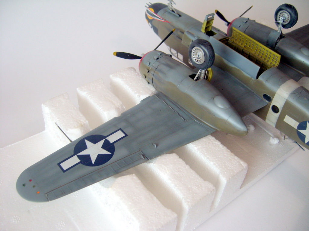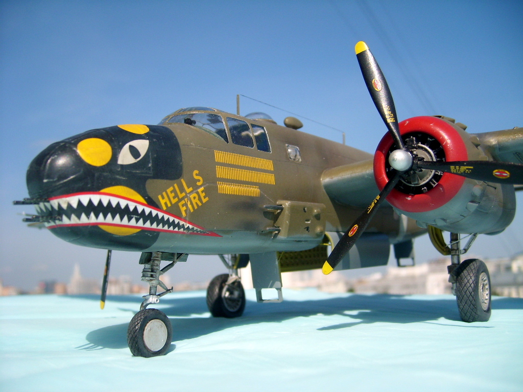 Всех приветствую!Хочу представить модель В-25D,штурмовой вариант среднего бомбардировщика.Этот кит от Italery перепаковка модели Accurate Miniature,о чем свидетельствует маркировка АМ на нижней плоскости крыла.Детали оказались поведенными и очень труднообрабатываемыми.Фюзеляж,крылья,мотогондолы требовали обработки,исправления,подгонки,и много штатлевки.При сборке так же использовался афтемаркет в виде фототравления Eduard(интерьер),смоляные колеса СМК,металлические стойки Scale Aircraft Convesion,стволы Quick Boost.Из основных доработок:стойки шасси,створки бомболюка,открытые люки,вехняя стрелковая точка,накладные панели из фольги,лампочки в фарах СМК,выхлопные патрубки в хвостах мотогондол мед.иглы.Красил акрилом Tamiya,низ-Netral Gray,верх-осветленный Olive Drub,внутренние части Chromate Zhink.Сделал светло-бежевый фильтр,потом глянец.Декали "родные",но жесткие,приваривал Sol и Set.Снова глянец.После просушки масляные точки(краски Гамма на Миговском растворителе).Финишный лак-футура с добавлением Х-21(матовая присадка).Вкратце так.Этапную постройку можно посмотреть здесь http://scalemania.ru/forum/viewtopic.php?f=11&t=518.Приятного просмотра!