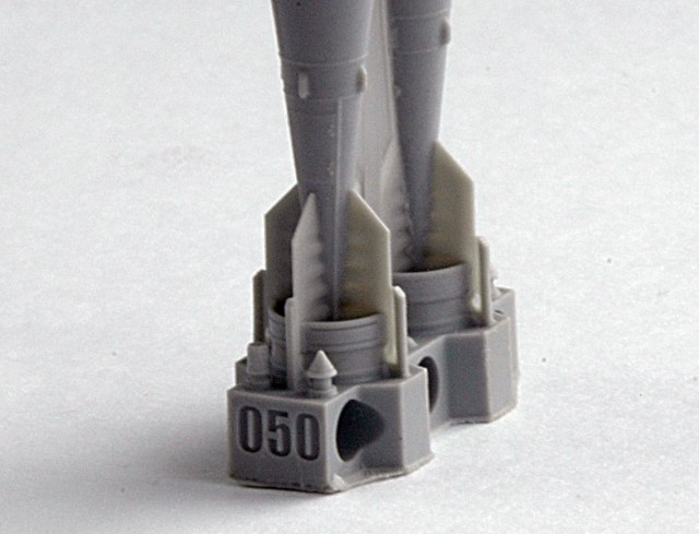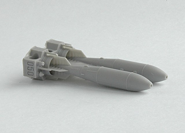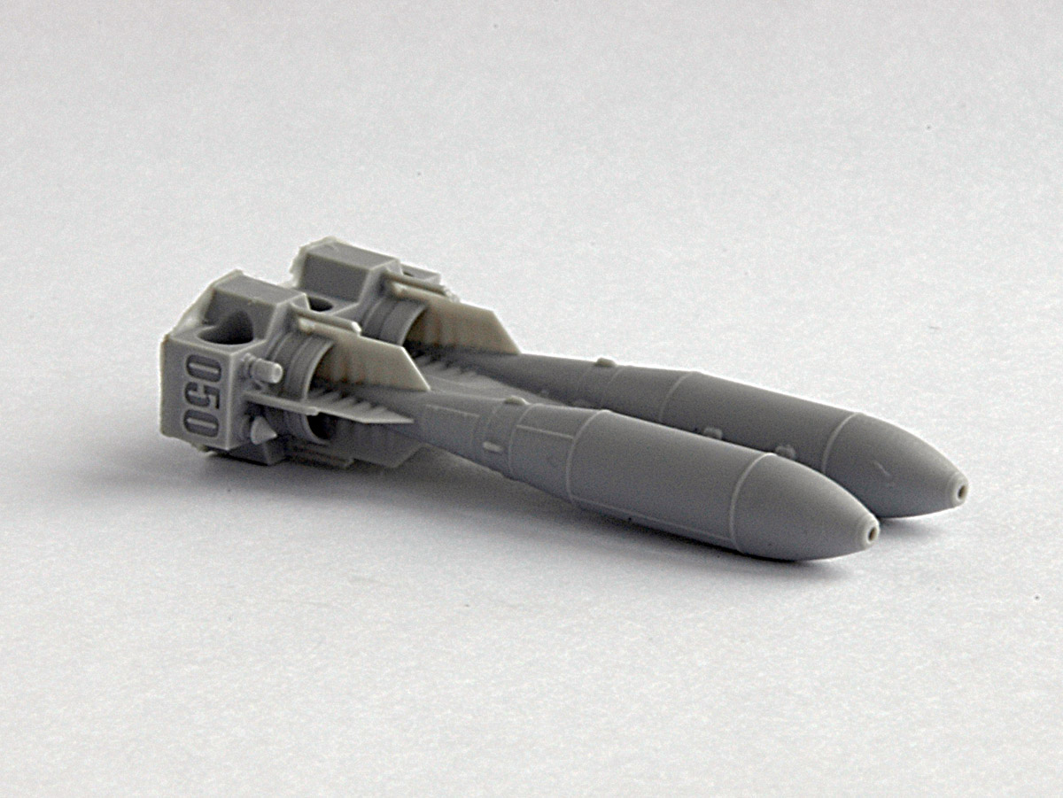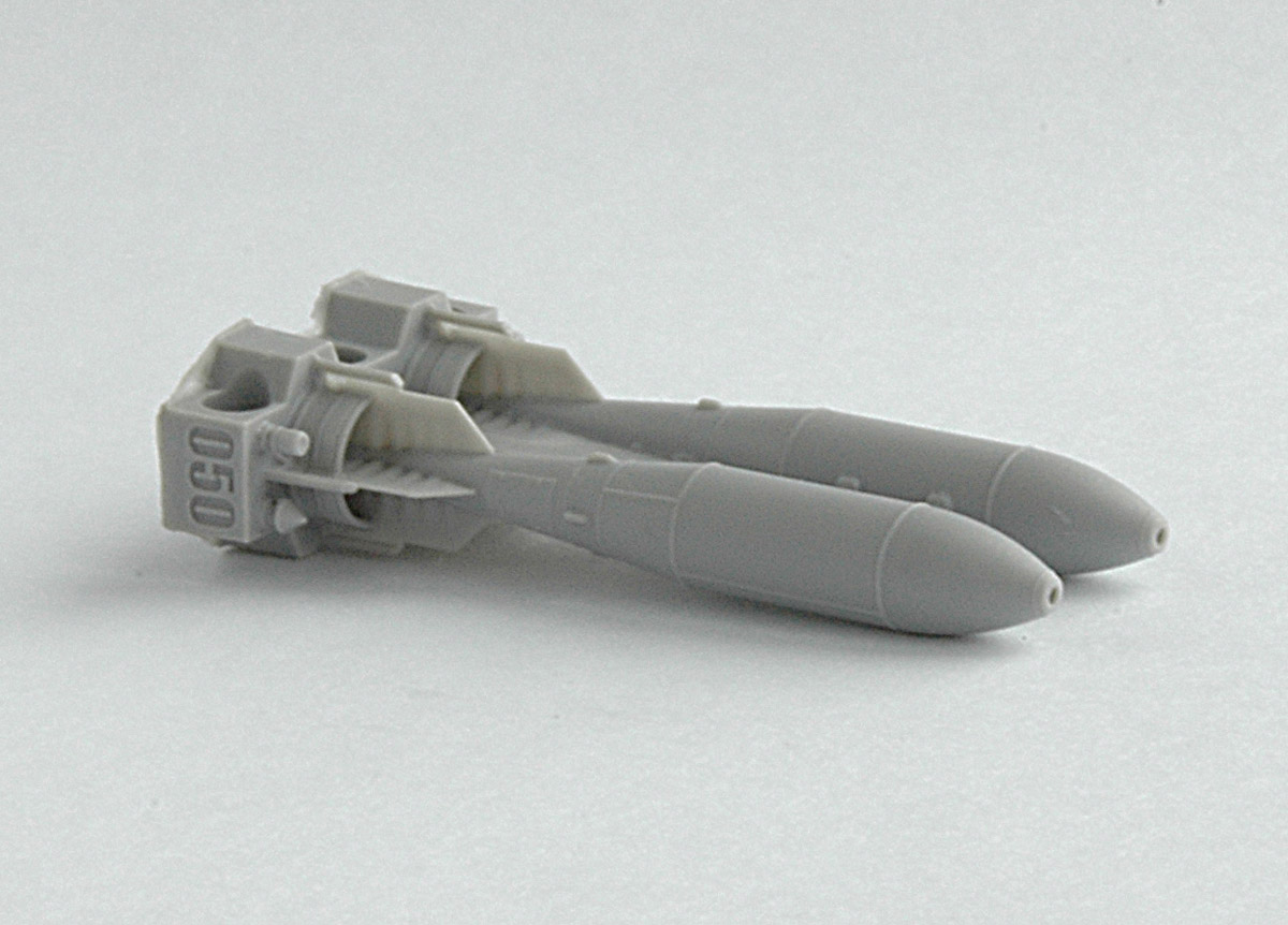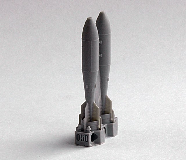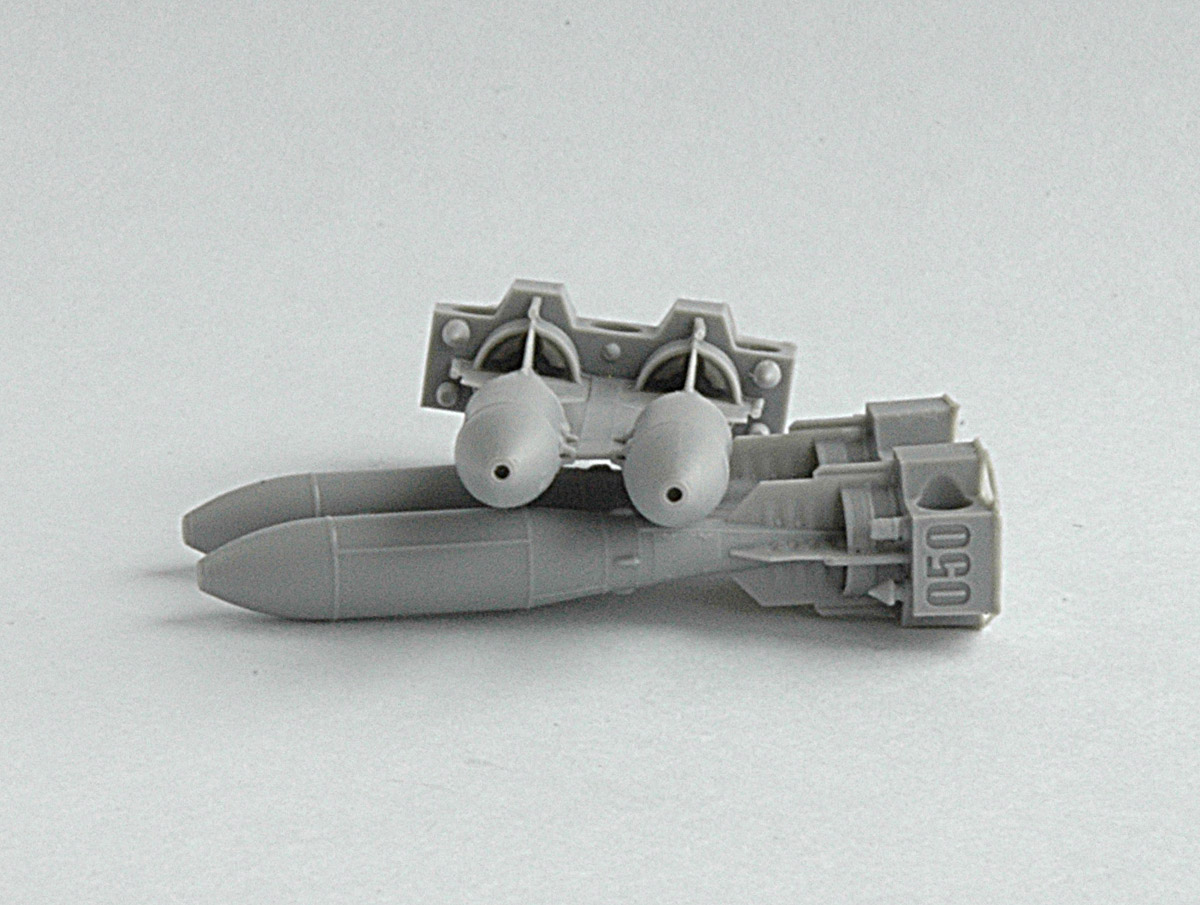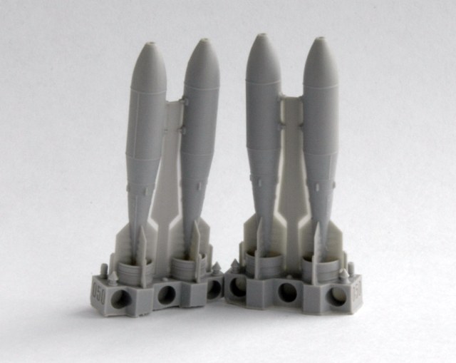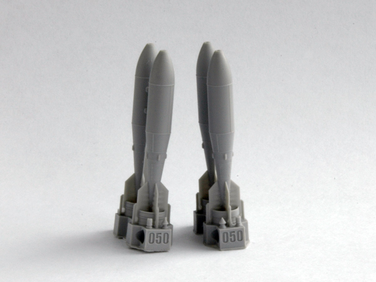В комплекте АМС 48050 поставляется четыре авиабомбы ОФАБ-250Т. Авиабомбы отлиты из серой полиуретановой смолы и внешне очень похожи на ранее выпущенные ФАБ-250 М-62. На литнике расположены две авиабомбы объединенные вертикальным пилоном. Следует отметить достаточно тонкие стабилизаторы, хорошую проработку сварных швов и люка (с замками и петлями) для доступа к донному стакану с детонатором. Характерной особенностью авиабомбы ОФАБ-250Т являются выштампованные ребра жесткости на перьях и кольце стабилизатора. На уменьшенной копии авиабомбы выштамповки великолепно проработаны и являются украшением изделия. Несомненным достоинством является то, что авиабомбы отливаются в одну деталь вместе со стабилизаторами, что позволяет моделисту средней квалификации отделить изделие от литника буквально за несколько минут.