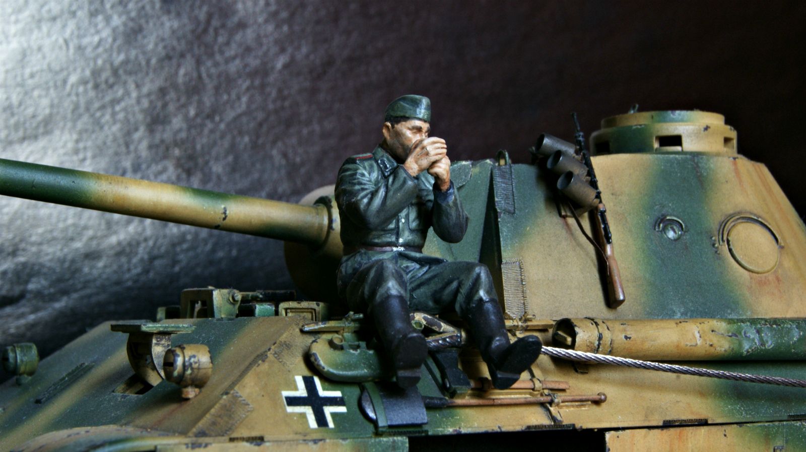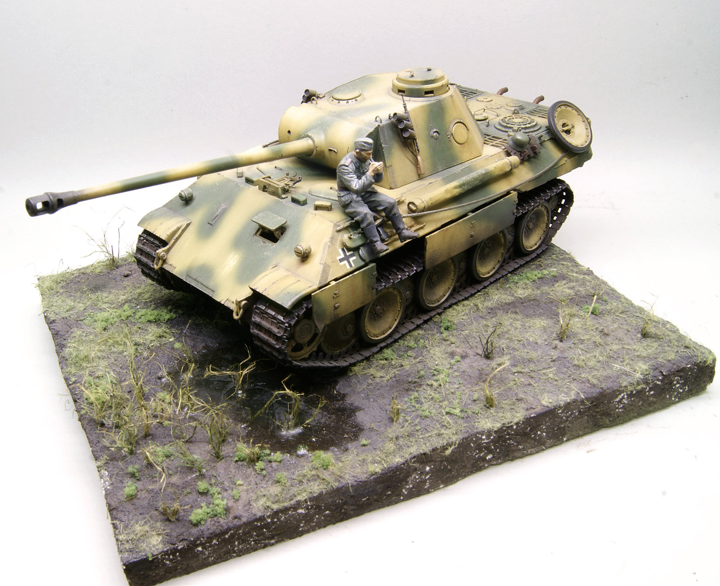 Хочу представить Вам свою пятую работу - Panther D от ICM. Это первая модель, к которой я постарался подойти со всей серьезностью,на сколько смог) Вообще,она стала полигоном для испытаний! Здесь первый опыт работы аэрографом, использование самодельного фильтра,приминение пигментов (раньше пастэлью пользовался),так же в первые попробовал сколы с "подложкой"...и в первые поставил модель не на полку,а на подставку. Дэкали развалились в руках...ну это уже не новость от данной фирмы. По-этому машина безномерная. Вообще планировалась машина почти новая, перед битвой на Курской дуге. Еще первый раз в жизни расписывал фигурку и изготовил ведро. Вобщем, что вышло - судить Вам!) (модель делал 06.2013, выкладываю второй раз с нормальными фото)