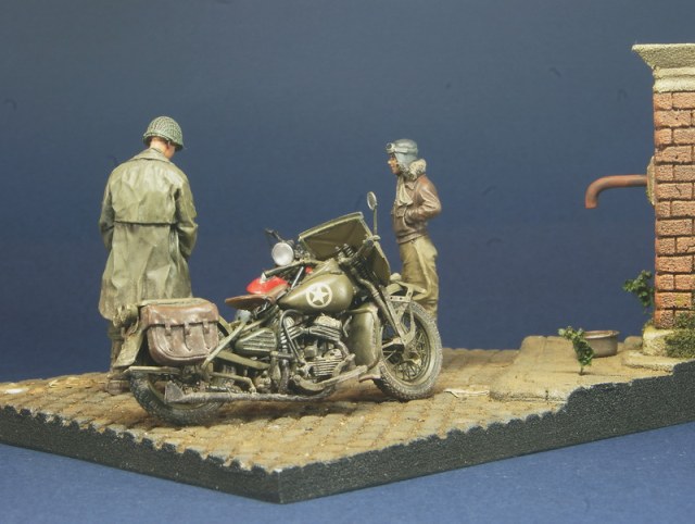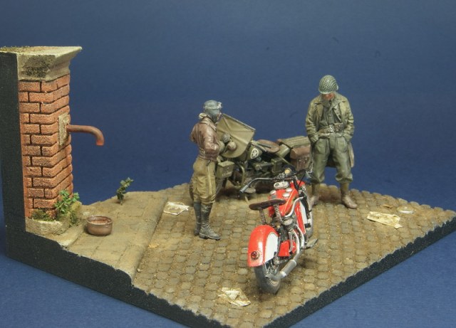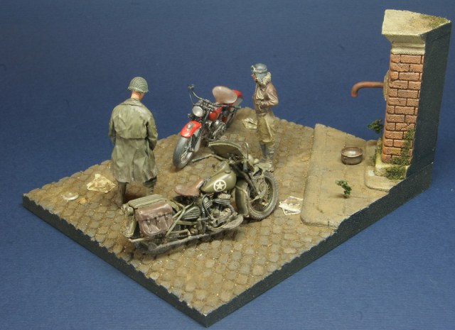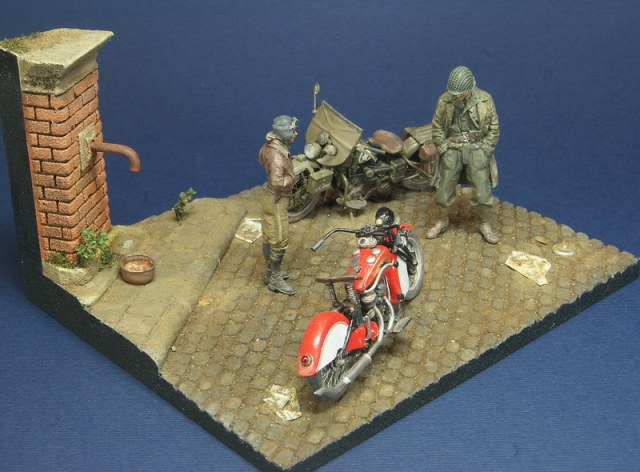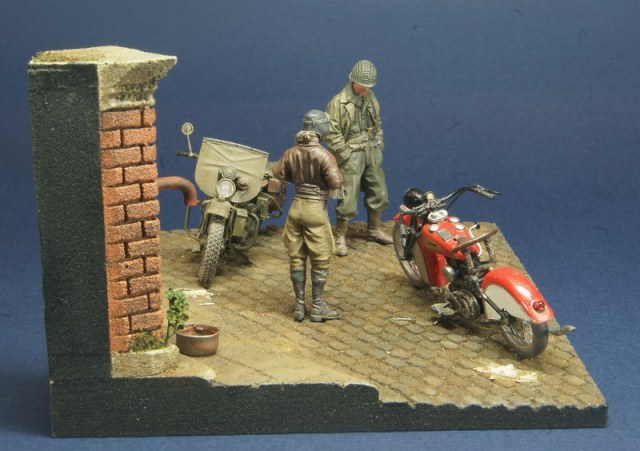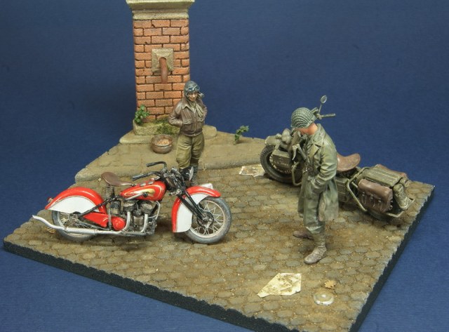 Небольшая виньетка на тему американской дорожной классики. В качестве героев Indian 741b от Swash и Harley от Miniart. Основание - база от Celticwrecks, фигурки от Swash и Alpine. Весь сюжет вырос вокруг новинки от японской Swash Design Indian 741b модели из белого металла и смолы - сборка не самое приятное занятие, да и цена не соответствует качеству. Harley был сделан больше года назад и попал в сценарий совершенно случайно. Сюжет .... каждый волен додумать сам)