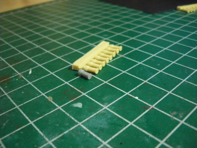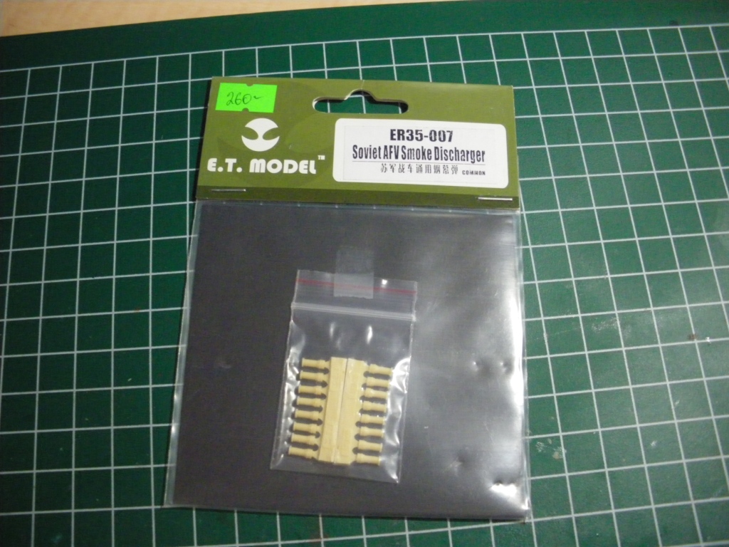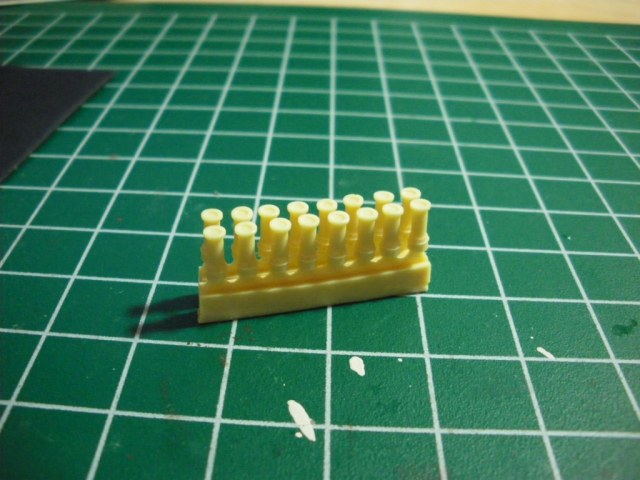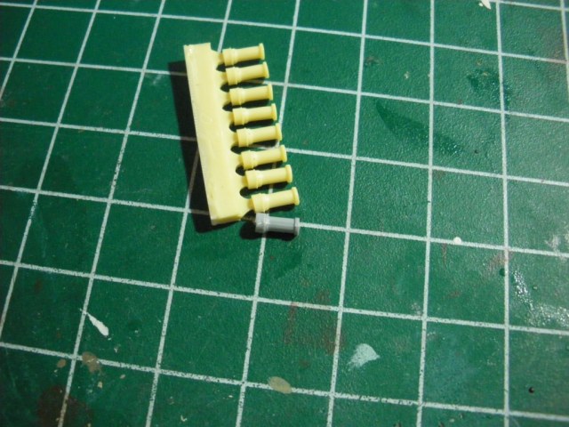 В небольшом пакетике - другой небольшой пакетик, а в нем... 2 небольшие смоляные отливки. Каждая из них содержит 8 гранатомётов, и того - 16 штук, мне на Т-90 надо 12, так что 4 ещё останутся. Качество великолепное, выемки на крышках присутствуют. В сравнении с родными звездинскими - небо и земля...