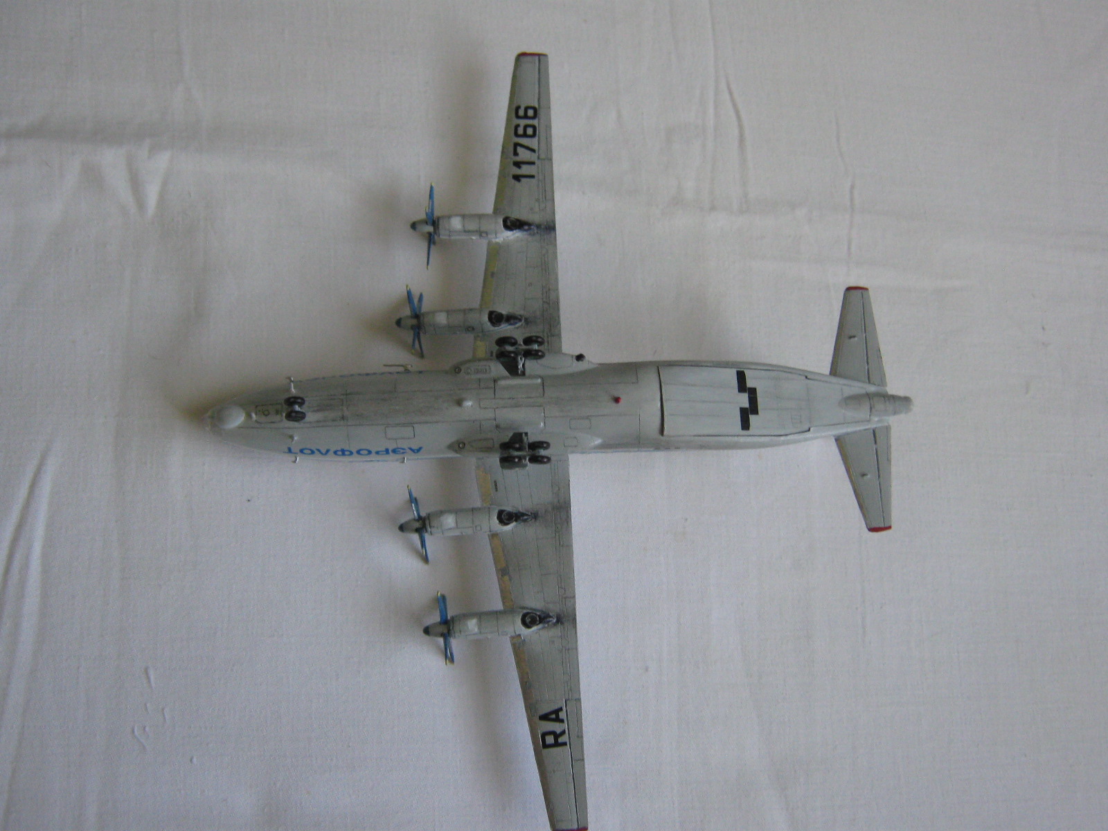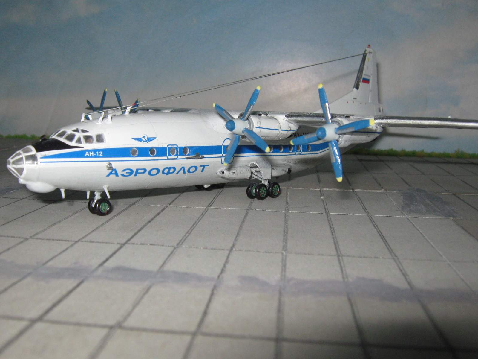 Приветствую всех уважаемые коллеги, хочу продемонстрировать вам легендарного трудягу ан-12, данный борт эксплуатировался с 1963-1999 по России, затем был продан в Украину где сейчас и летает под номером UR-CZZ Украина-аэроальянс. Теперь о постройке которая длилась около 2-ух недель, качество пластика хорошее, декали не плохо привариваются, не рассыпаются, что очень понравилось, стыкуемость деталей нормальное, пришлось повозится с левым 2-ым движком, проблема была с неправильным улом установки, сколько не пилил довести до идеального не получилось, остекление не понравилось, не совсем соответствует прототипу, хотя я их вклеил половина была испорчена парами клея, пришлось выдавливать, и вырезать из прозрачного трафарета свои, которые были посажены снаружи на лак, с кабиной пилотов тоже пришлось повозится, так как после снятия масок стекла были совершенно мутные, пришлось шлифовать, полировать, и тоже остался не доволен, так как мутность не много присутствует, грузовую рампу не вклеивал, хотел сделать грузовой отсек, но это на будущее. Теперь о покраске, на этой модели я решил проэксперементировать,т.е, сначала красил половинки фюзеля, из баллона "ABRO" белая, пузо кистью акрилом, минимум глянцевого лака, затем не много тонировки, из доработок бано, по левому борту антенна, проволока, проблесковые маячки, натяжные антенны-нить, надписи на гондолах от revell, про основные написал, в общем смотрите, критикуйте...