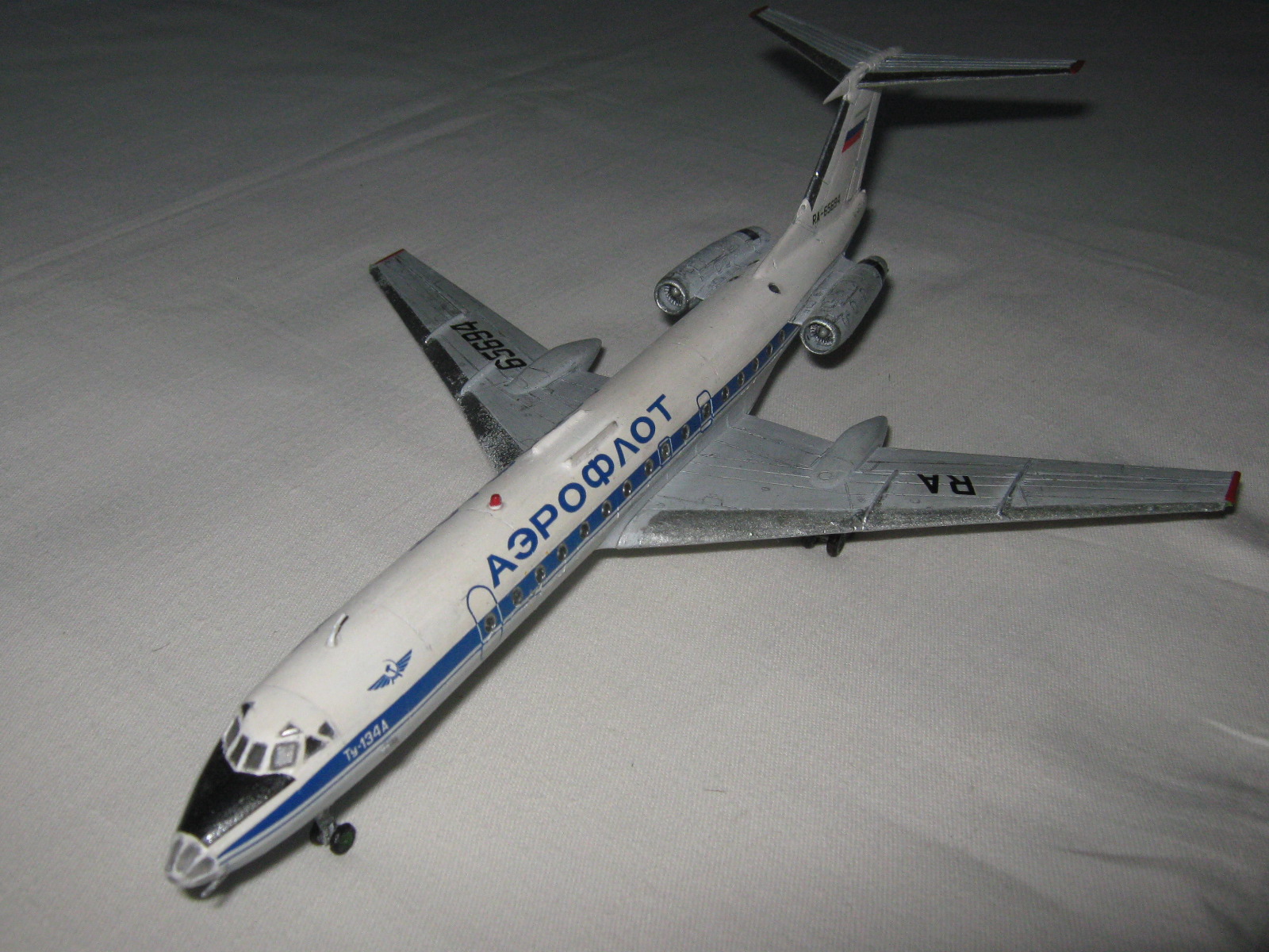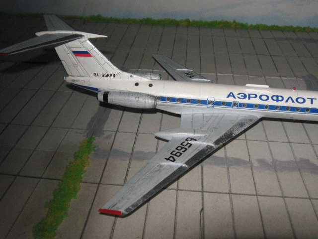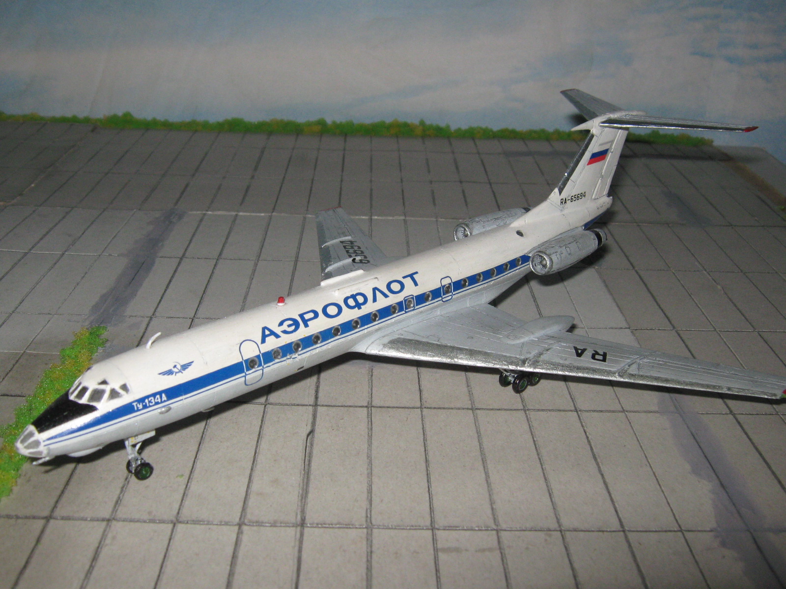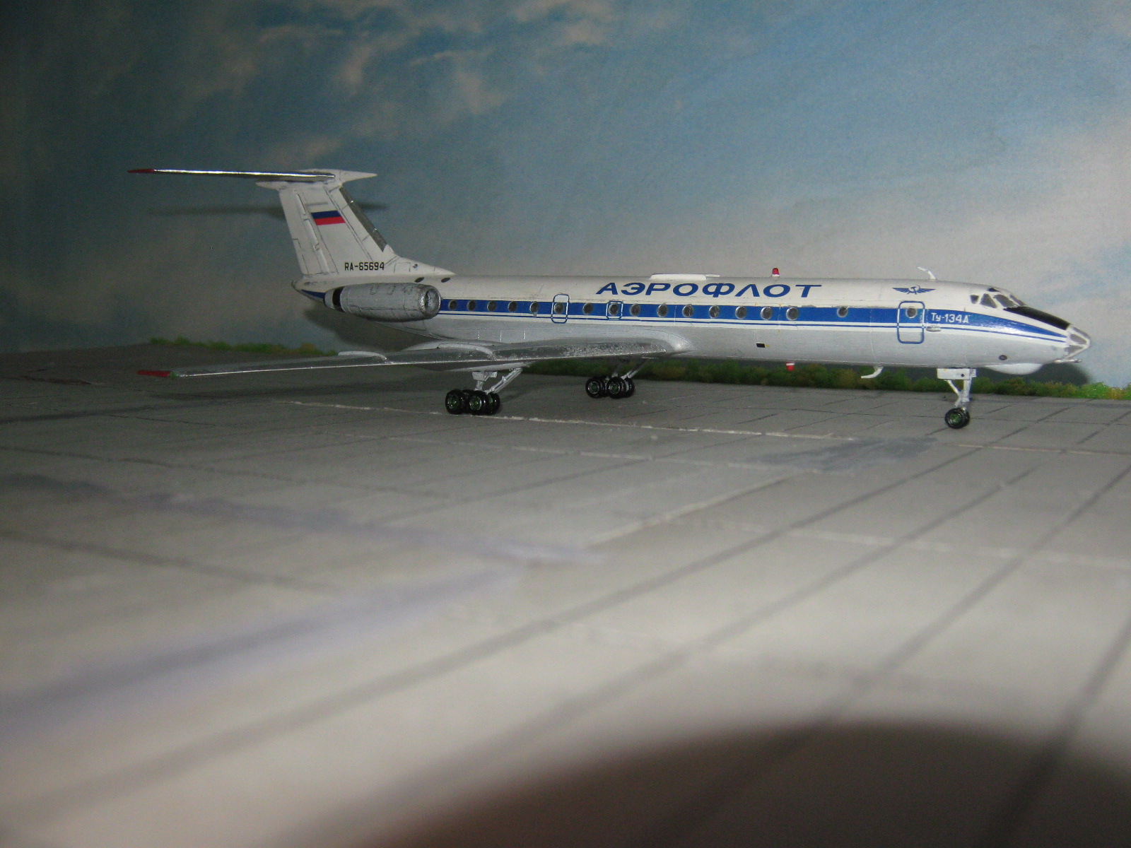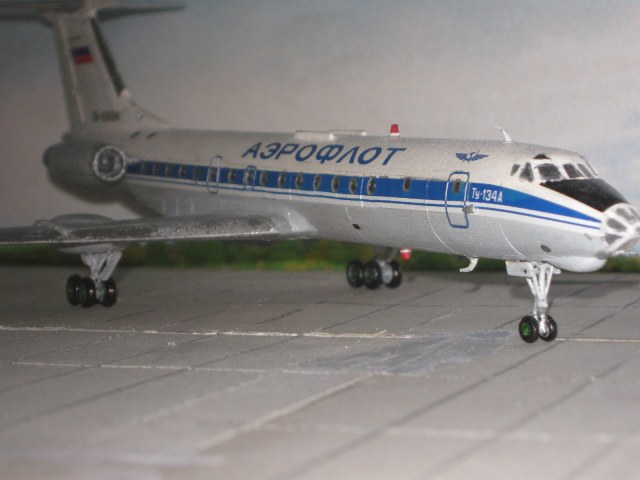 Привет всем уважаемые коллеги, вот выставляю не совсем удачный экземпляр ту-134А, модель полностью красилась кистью, акриловой краской, белый цвет с оттенком, на фото может не заметно, стройка велась две недели, приходилось исправлять покрасочную работу, в целом набор понравился, и в сборке, и дека не плохая, в процессе покрытия лаком по левому борту декаль поползла исправлять не стал, из доработок проблесковые маячки, левый предкрылок окрашен краской"алюминевая пудра с олифой", правый фольга, так оставил до будущих времен, просто запал пока к нему отсутствует, смотрите, оценивайте...