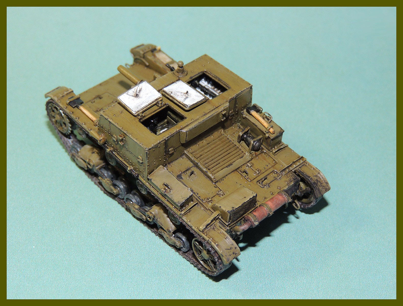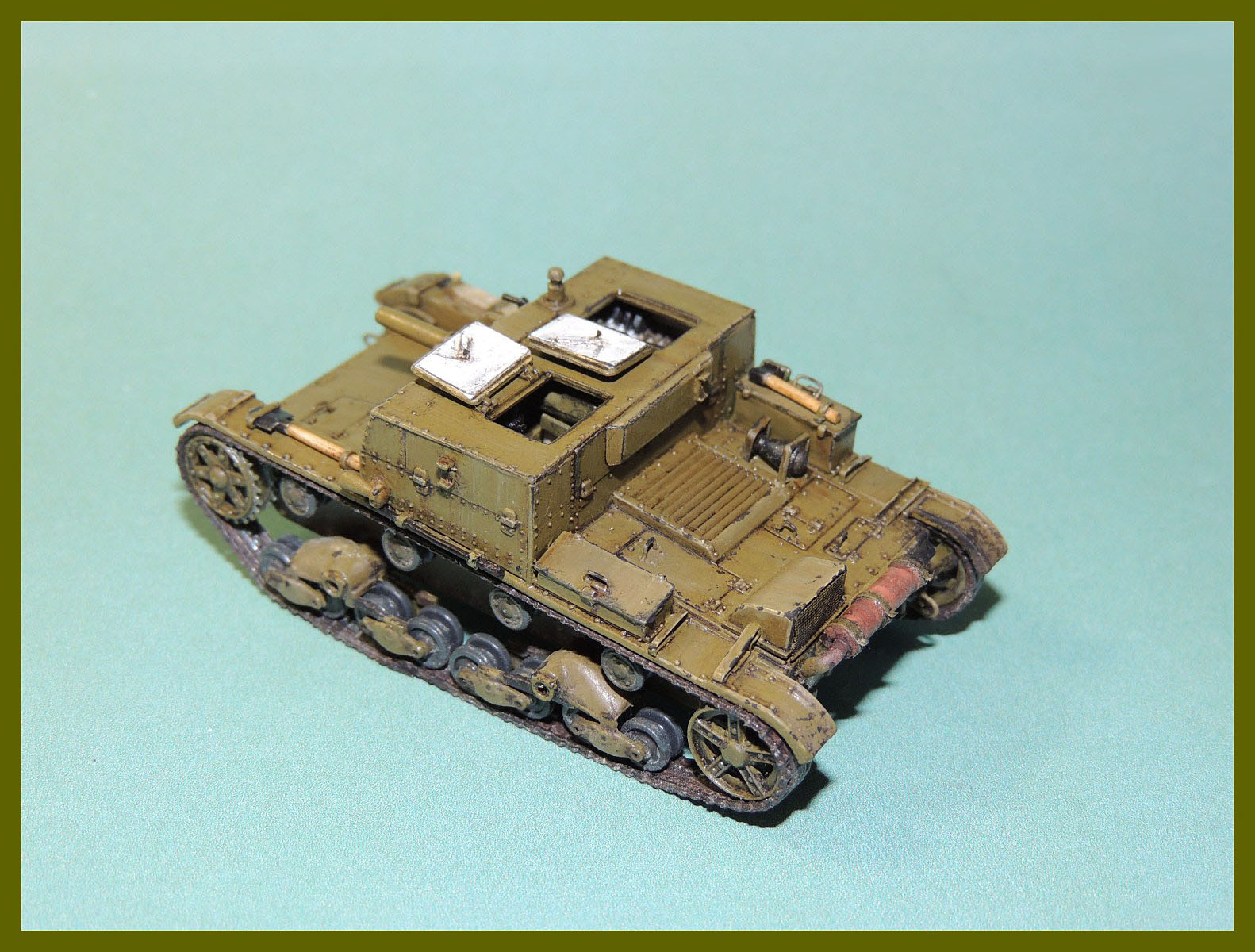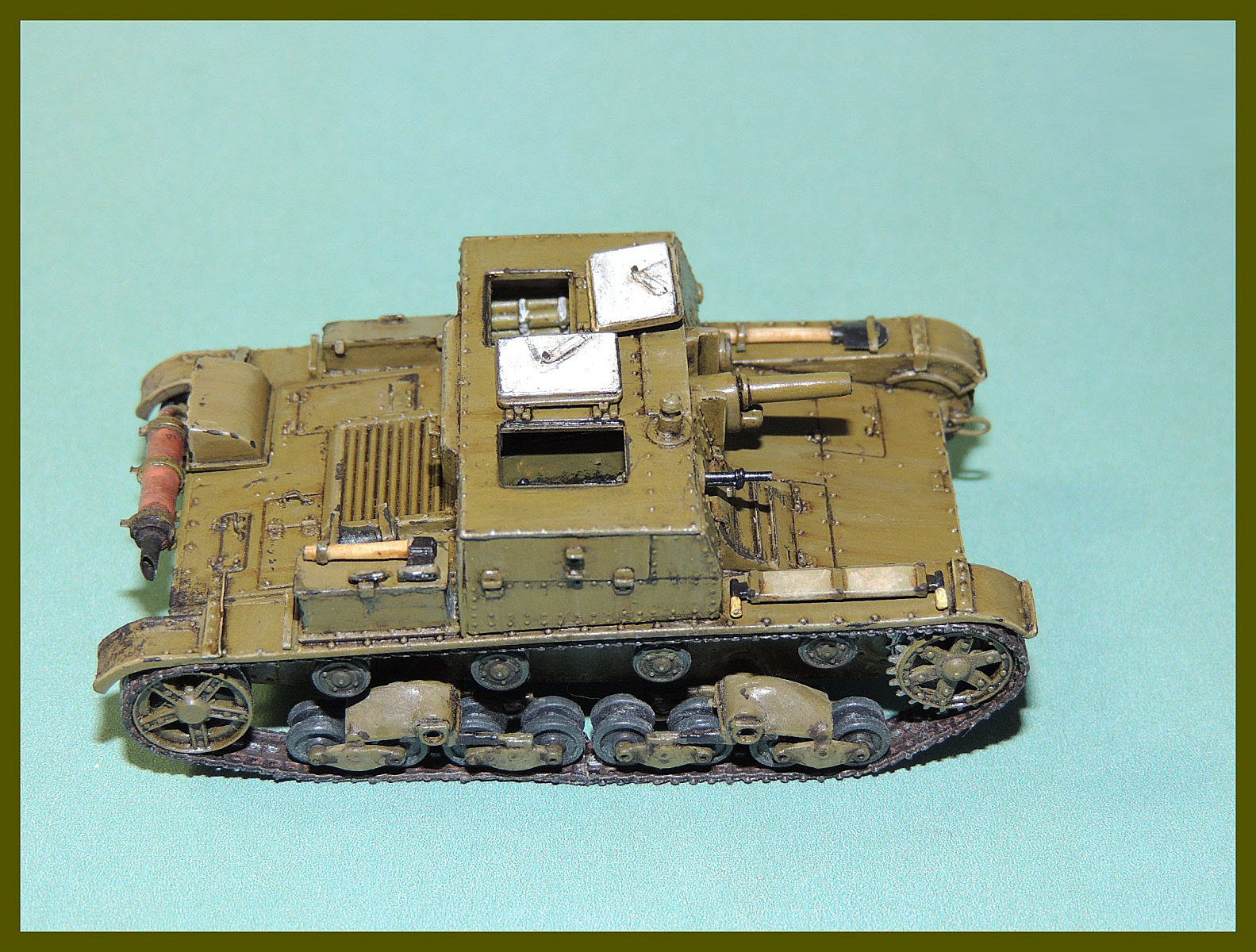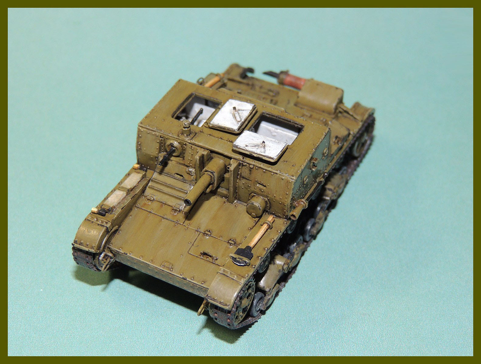 Всем здравствуйте! Выставляю свою очередную работу,снова это "Мираж"(машина без альтернативная,чем производитель и берёт),одна из первых отечественных самоходок на базе Т-26,АТ-1.По сборке,хотелось отметить плохую стыкуемость деталей рубки,с неточной геометрией по ширине.Пушку пришлось тоже переделать,заменить ствол,добавить перископ.Добавил кресло механика,но его нормально отснять не удалось.Хотелось сделать,открытыми все наличествующие люки,но не мог найти информации(точной о внутренних поверхностях этих люков и механизмах их запирания)В результате,открытыми сделал только верхние люки,с простейшими поворотными задвижками(которые имели место быть на люках тех же Т-26-х). Сделал новую выхлопную(родная "не пляшет" ). Заменил ствол пулемёта на иглу,вставил сетку в кожух воздухооттока.ну и так по мелочи добавил медных элементов.